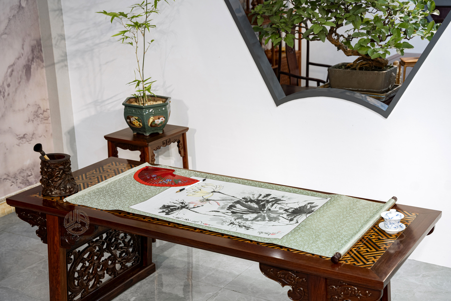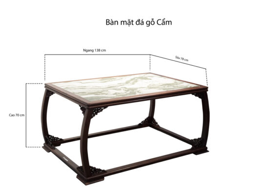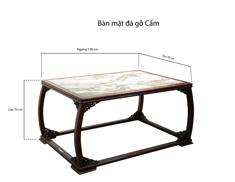 Toàn bộ khung bàn được làm từ gỗ Cẩm tự nhiên, dòng gỗ quý hiếm nổi tiếng với độ nặng chắc, thớ gỗ mịn và hệ vân uốn lượn mềm mại như mây trôi. Màu gỗ nâu trầm ánh đỏ đặc trưng của Cẩm càng dùng lâu càng lên nước sâu, bóng và sang, thể hiện rõ giá trị sử dụng lâu dài lẫn giá trị sưu tầm.
