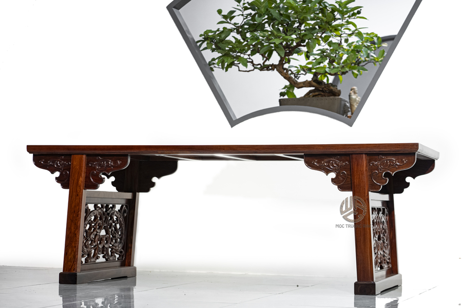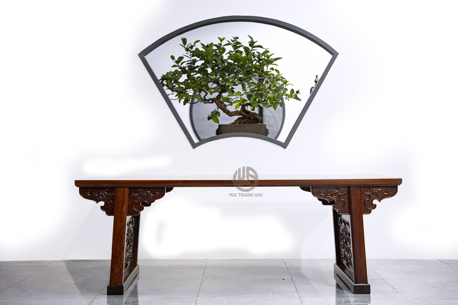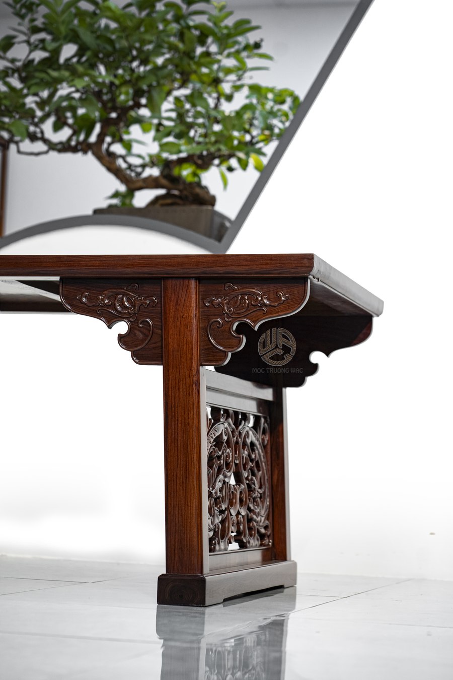 Dáng bàn bề thế, cân xứng, chân đứng vững chãi, phù hợp đặt tại phòng khách, phòng trà, không gian thờ hoặc khu vực tiếp khách trang trọng. Bàn vừa có giá trị sử dụng thực tế, vừa là món nội thất mang ý nghĩa tinh thần và phong thủy sâu sắc.