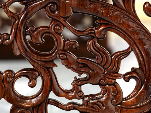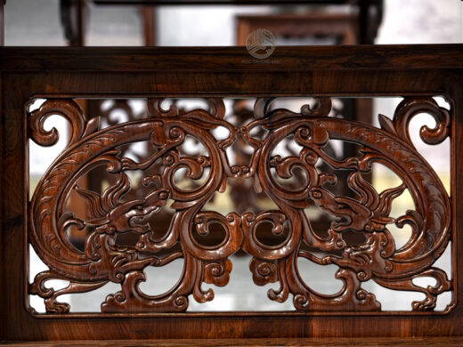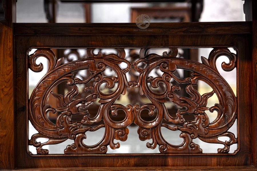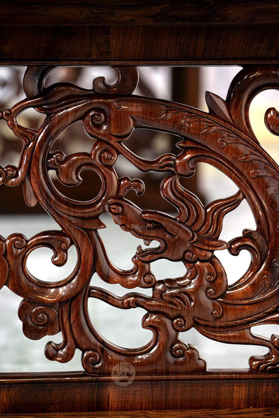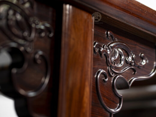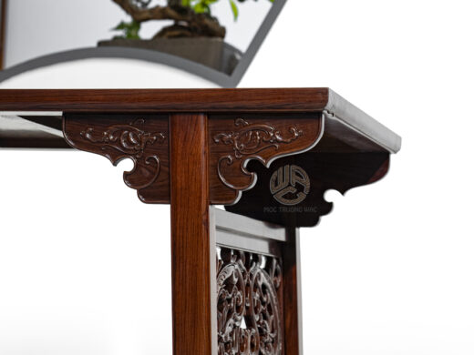 Phần yếm và chân bàn được đục liên hồi thủ công, hoa văn liền mạch, nhịp điệu đều, tượng trưng cho sự liên tục, vượng phát và hài hòa giữa thiên – địa – nhân. Đường nét chạm không phô trương mà tinh tế, thể hiện rõ tay nghề và gu thẩm mỹ của nghệ nhân làng nghề.