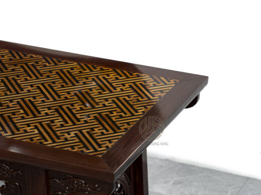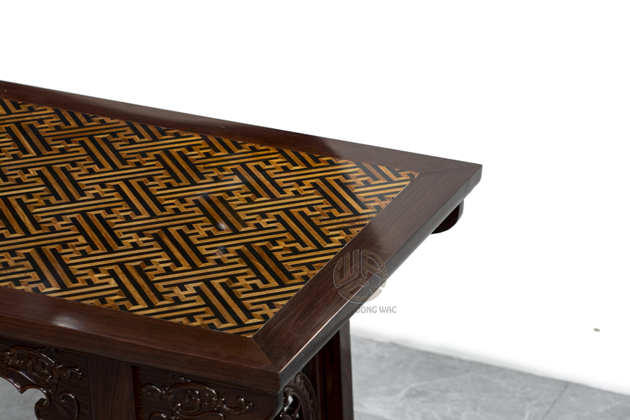 Điểm nhấn nổi bật nằm ở mặt bàn ghép họa tiết chữ Vạn – biểu tượng cổ truyền của phúc lộc, trường thọ và sự an lành trong văn hóa phương Đông. Các ô chữ được ghép chuẩn xác, tỷ lệ đều, bề mặt xử lý kỹ lưỡng, tạo chiều sâu thị giác và mang ý nghĩa phong thủy cát tường cho không gian đặt bàn.