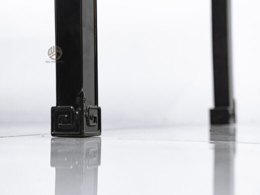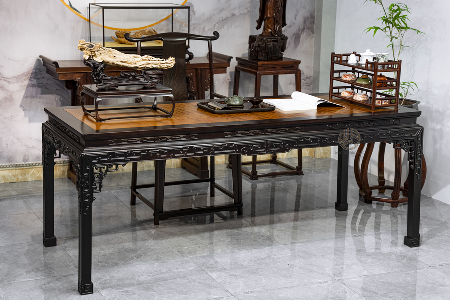 Phần khung bàn làm từ gỗ Tử Đàn, dòng gỗ nổi tiếng với độ cứng cao, kết cấu chắc nịch, khả năng chịu lực tốt và rất ít biến dạng theo thời gian. Gỗ Tử Đàn có sắc trầm sang, khi lên nước tạo chiều sâu màu sắc, càng dùng lâu càng bóng đẹp và giá trị tăng dần.