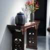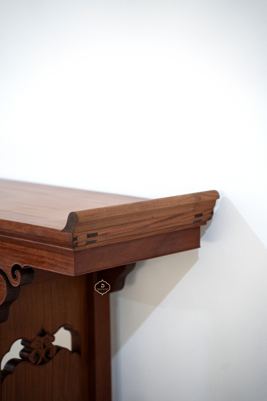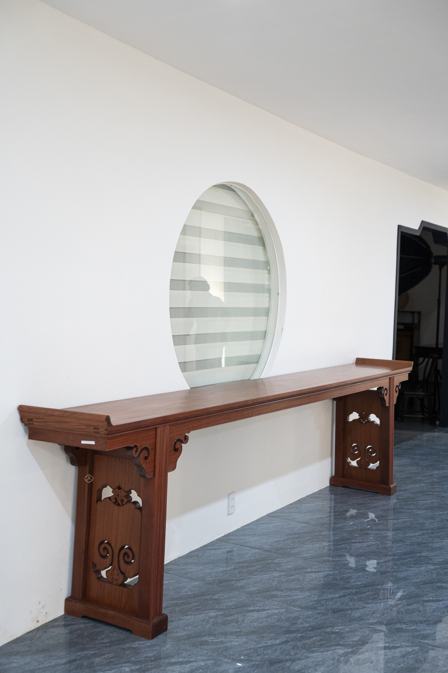 Với kích thước lớn, bàn phù hợp đặt tại phòng thờ, phòng khách rộng, sảnh hành lang hoặc không gian trưng bày, dùng để bày bình gốm, đồ decor, tượng, vật phẩm thờ hoặc làm bàn tiếu trang trí dài. Tổng thể bàn mang vẻ trang nhã, bề thế nhưng không nặng nề, dễ kết hợp với các món nội thất gỗ truyền thống khác.