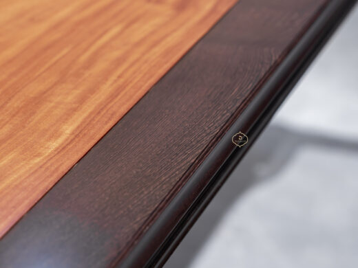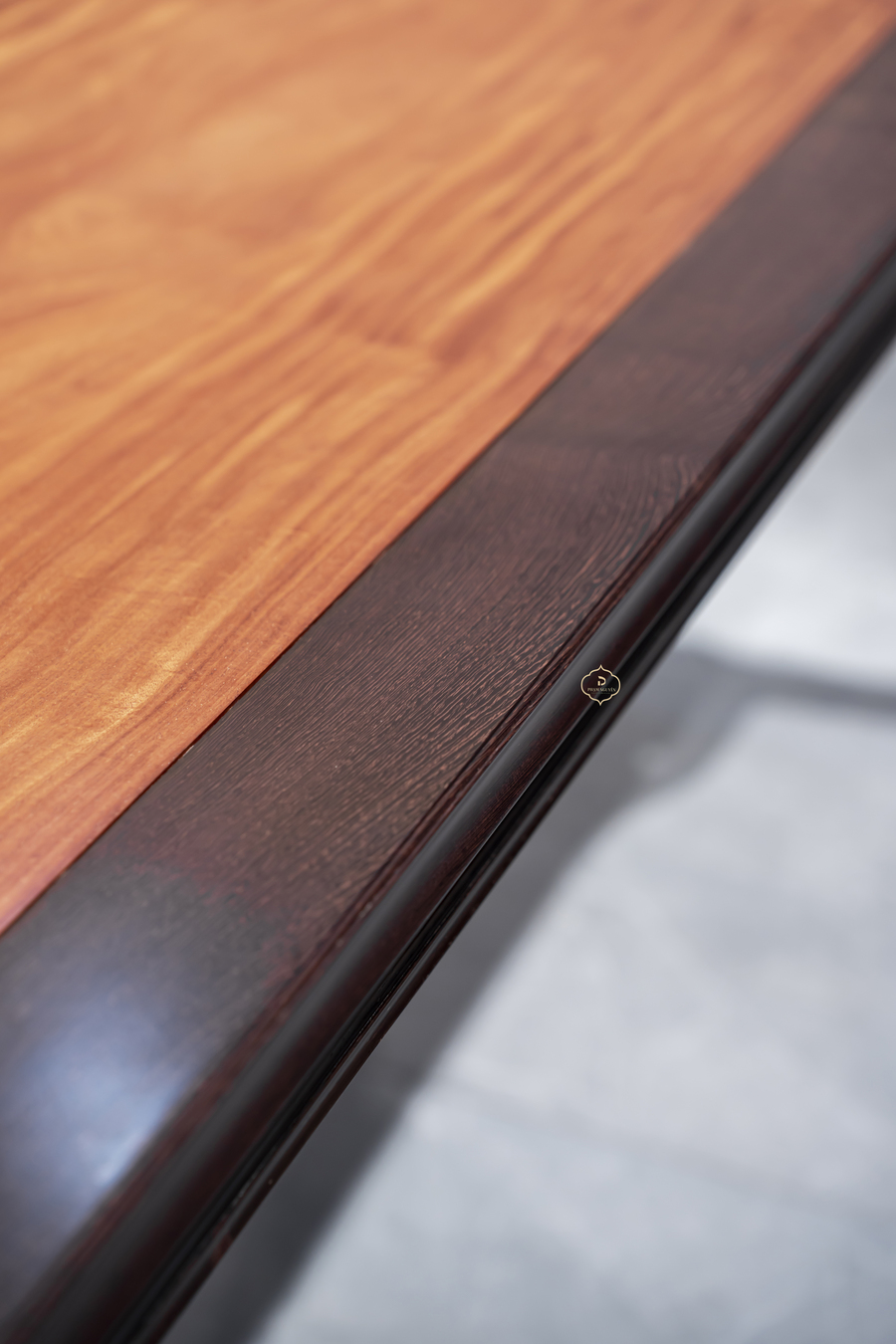 Mặt bàn làm từ gỗ Hương Nam Mỹ, nổi bật với màu nâu đỏ ấm, vân gỗ rõ và bề mặt phẳng mịn. Gỗ Hương có mùi thơm nhẹ đặc trưng, càng sử dụng lâu càng lên màu sâu và bóng tự nhiên, mang lại cảm giác sang trọng nhưng vẫn gần gũi.