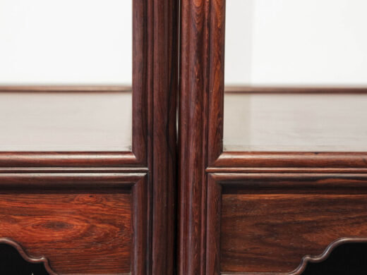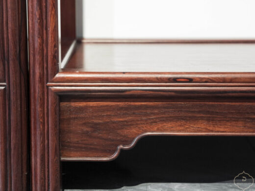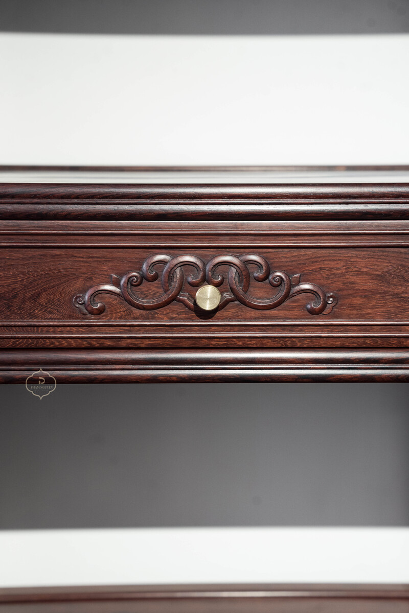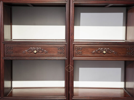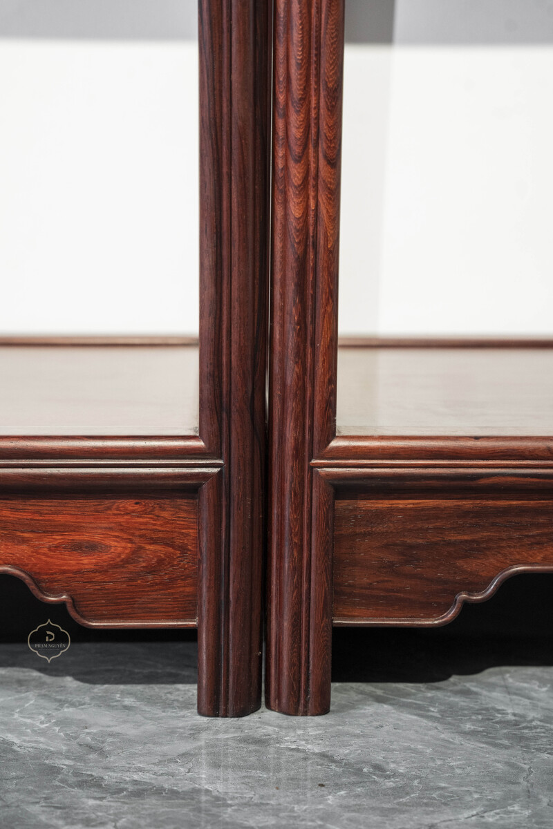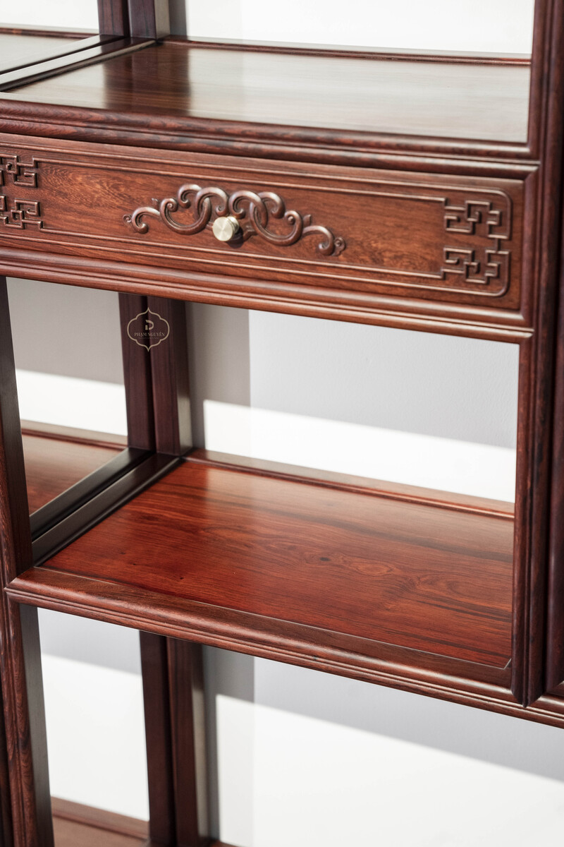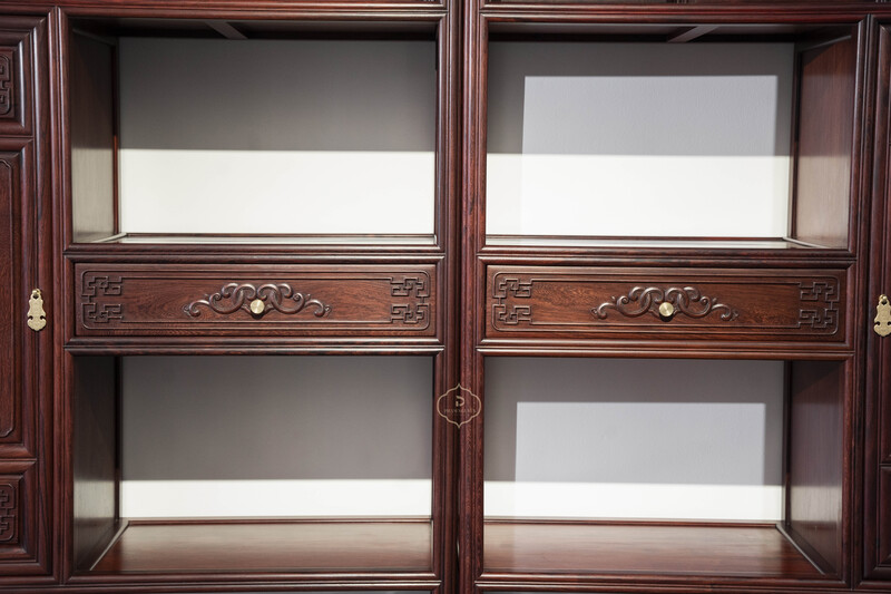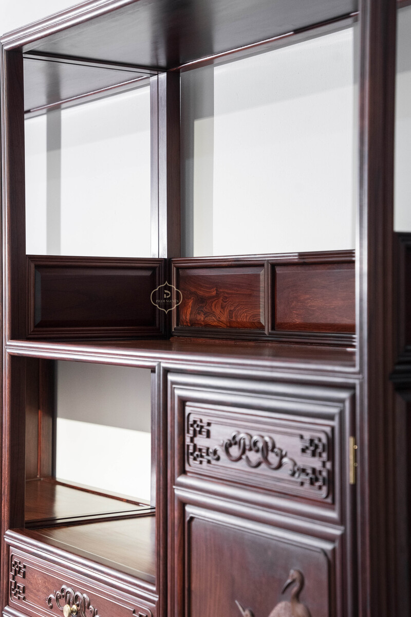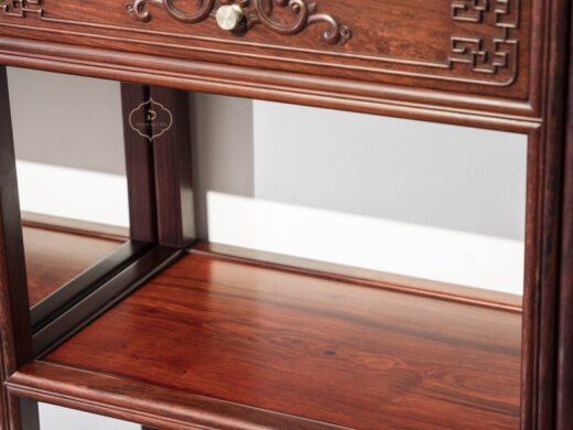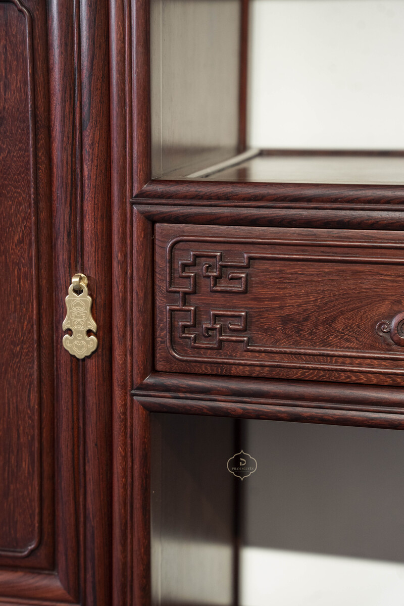 Thiết kế tủ dáng cao, khung gỗ thanh thoát, chia tầng hợp lý giữa khoang kín, ngăn kéo và kệ mở, thuận tiện cho việc trưng bày đồ decor, sách, ấm trà hoặc lưu trữ vật dụng quan trọng. Bố cục đối xứng khi đặt thành cặp tạo cảm giác cân bằng, trang nhã và rất “đúng chất” không gian truyền thống.
