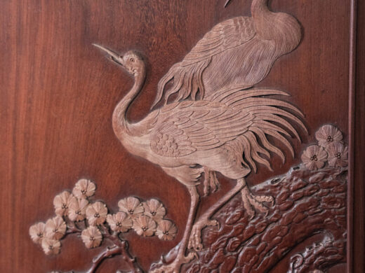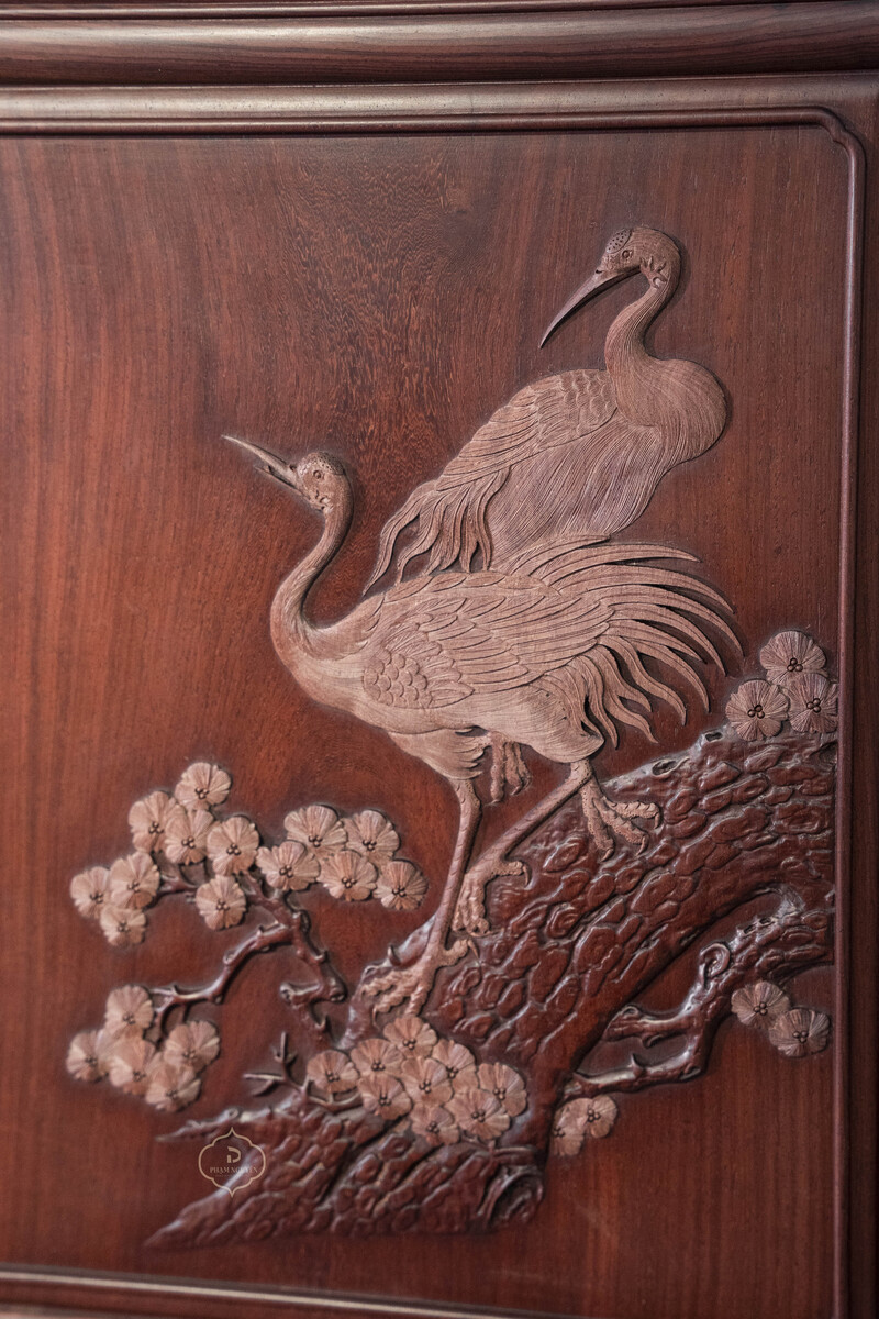 Điểm nhấn trung tâm của tủ là mảng chạm tích Tùng – Hạc Diên Niên trên cánh tủ: cây tùng tượng trưng cho khí tiết, sức sống bền bỉ; chim hạc biểu trưng cho trường thọ và thanh cao. Các đường đục tay được thực hiện tỉ mỉ, độ sâu vừa phải, nét chạm mềm và đều, tạo hiệu ứng nổi – chìm rõ rệt nhưng không làm tổng thể trở nên nặng nề.