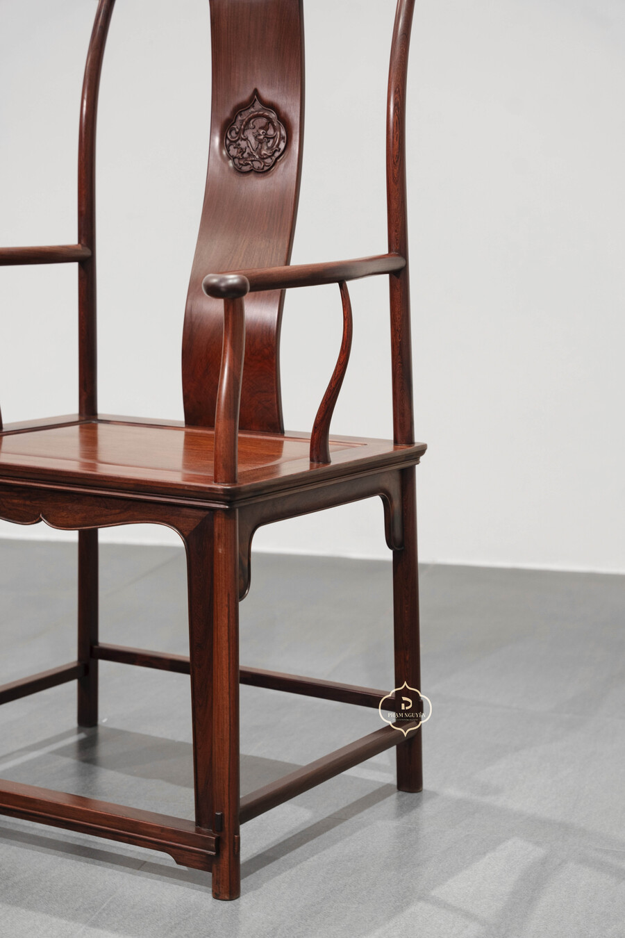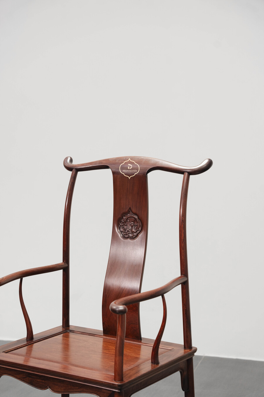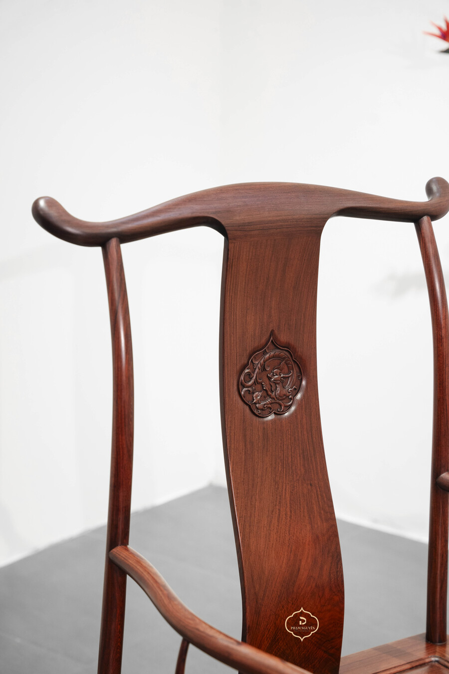 Thiết kế ghế mang dáng ghế chủ lưng cao, tạo cảm giác trang trọng, uy nghi nhưng không nặng nề. Phần lưng ghế liền tấm được chạm họa tiết trang trí thủ công, vừa tăng giá trị thẩm mỹ, vừa thể hiện tay nghề tinh xảo của người thợ. Tay vịn được uốn cong mềm mại, hỗ trợ tư thế ngồi thoải mái, phù hợp cho việc tiếp khách hoặc ngồi thưởng trà lâu.