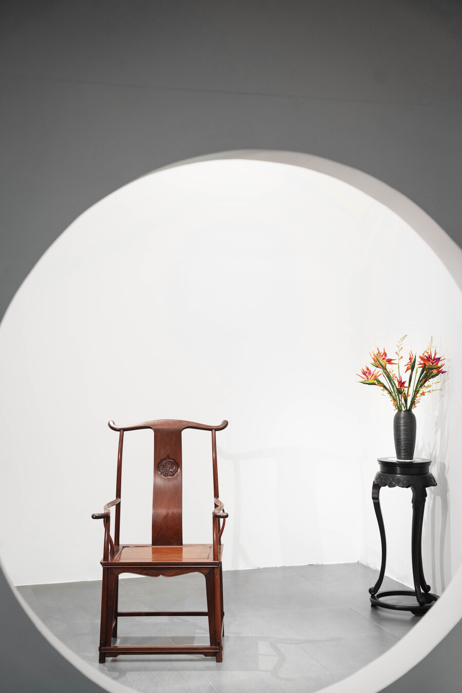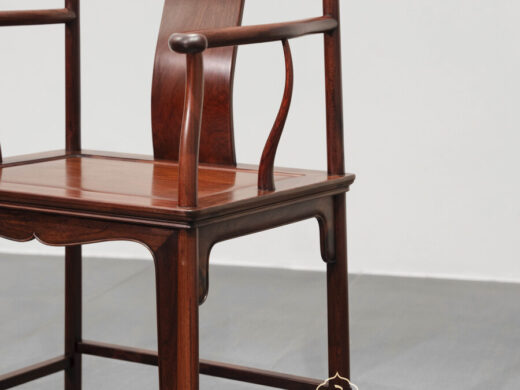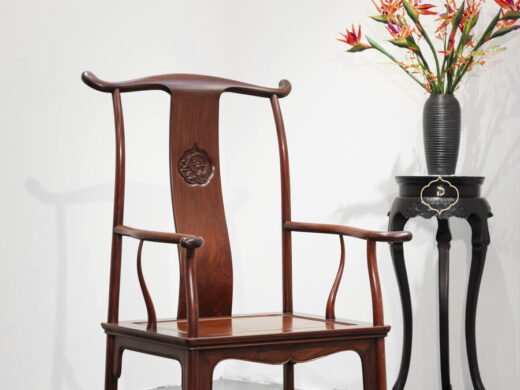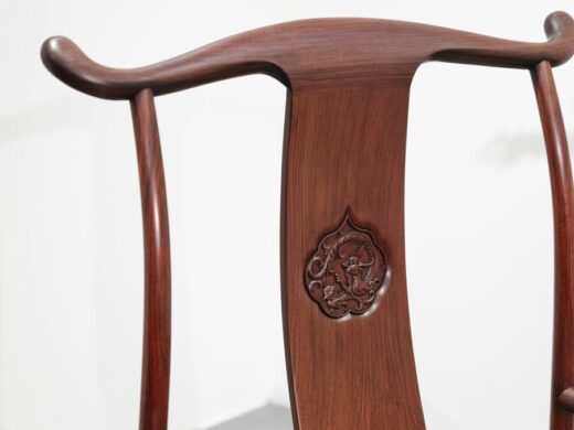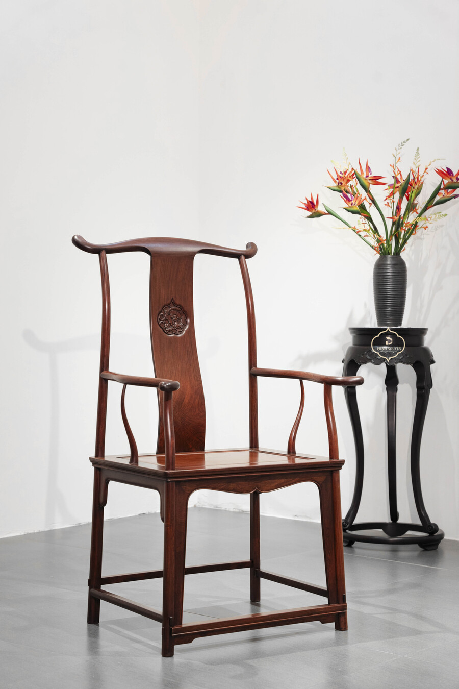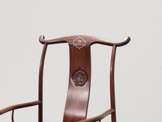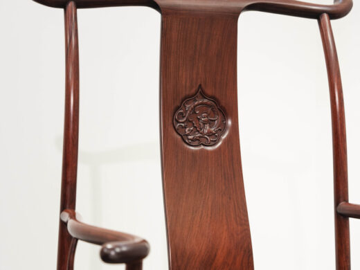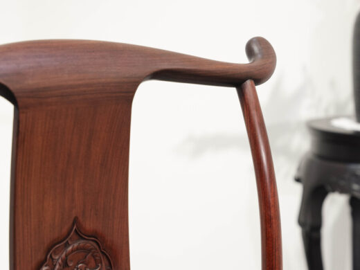 Thiết kế ghế mang dáng ghế chủ lưng cao, tạo cảm giác trang trọng, uy nghi nhưng không nặng nề. Phần lưng ghế liền tấm được chạm họa tiết trang trí thủ công, vừa tăng giá trị thẩm mỹ, vừa thể hiện tay nghề tinh xảo của người thợ. Tay vịn được uốn cong mềm mại, hỗ trợ tư thế ngồi thoải mái, phù hợp cho việc tiếp khách hoặc ngồi thưởng trà lâu.