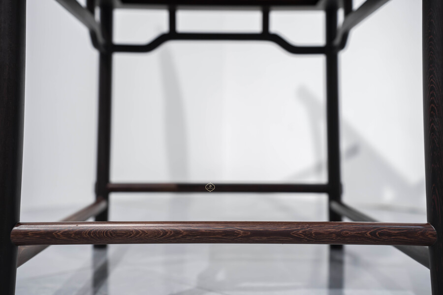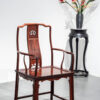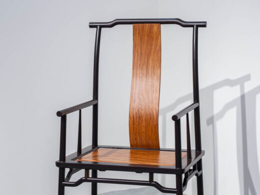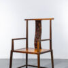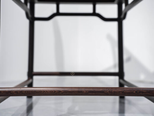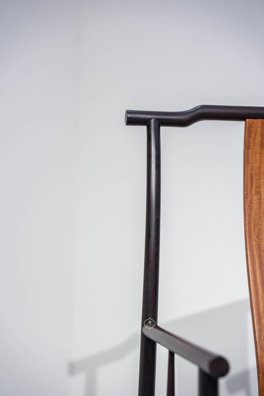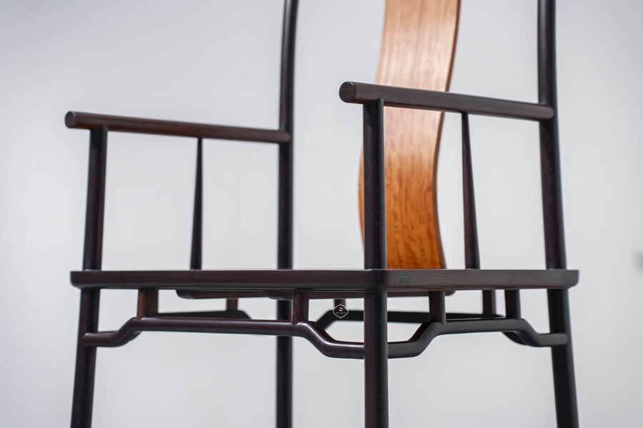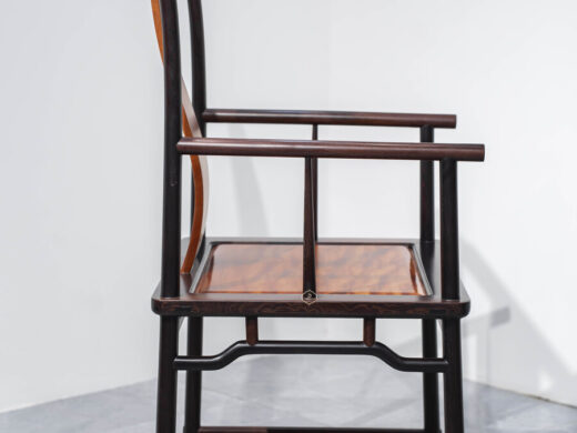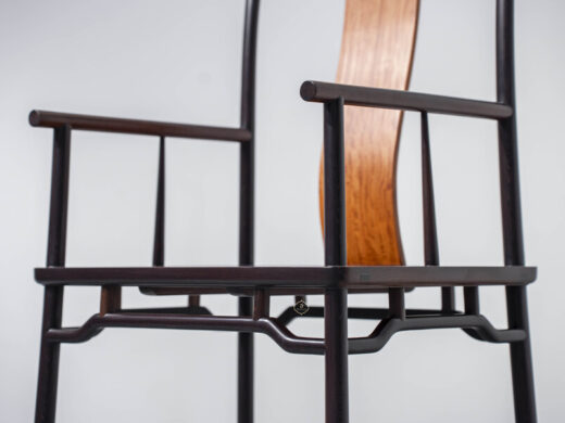 Dáng ghế chủ được giữ đúng tinh thần truyền thống: lưng cao, vai ngang vừa phải, tay vịn bo tròn mềm mại, tạo cảm giác thư thái nhưng vẫn giữ sự nghiêm cẩn. Các chi tiết được tiết chế, không chạm trổ cầu kỳ, thể hiện rõ tinh thần tối giản Á Đông – nơi vẻ đẹp đến từ tỷ lệ, đường cong và chất liệu.