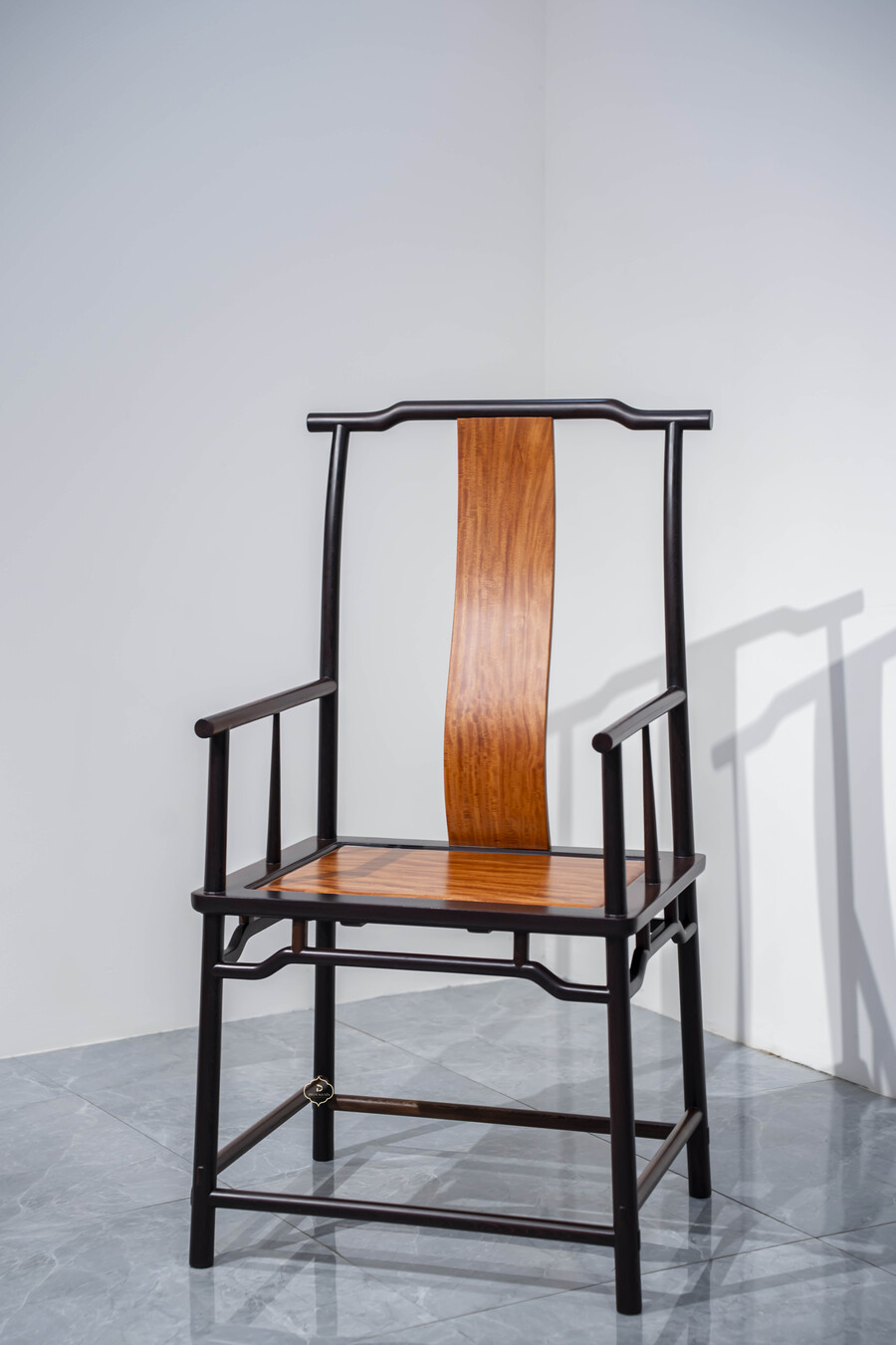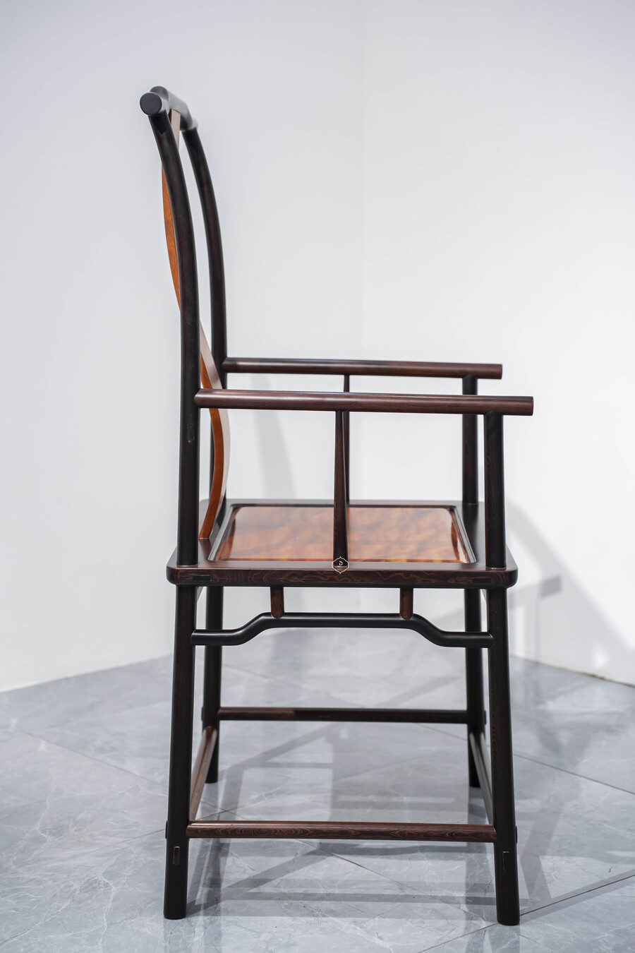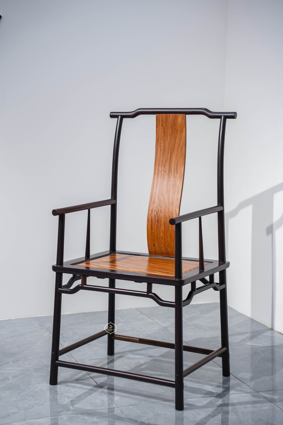 Dáng ghế chủ được giữ đúng tinh thần truyền thống: lưng cao, vai ngang vừa phải, tay vịn bo tròn mềm mại, tạo cảm giác thư thái nhưng vẫn giữ sự nghiêm cẩn. Các chi tiết được tiết chế, không chạm trổ cầu kỳ, thể hiện rõ tinh thần tối giản Á Đông – nơi vẻ đẹp đến từ tỷ lệ, đường cong và chất liệu.