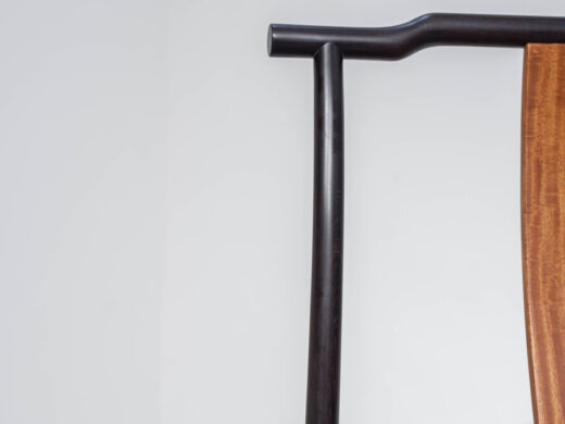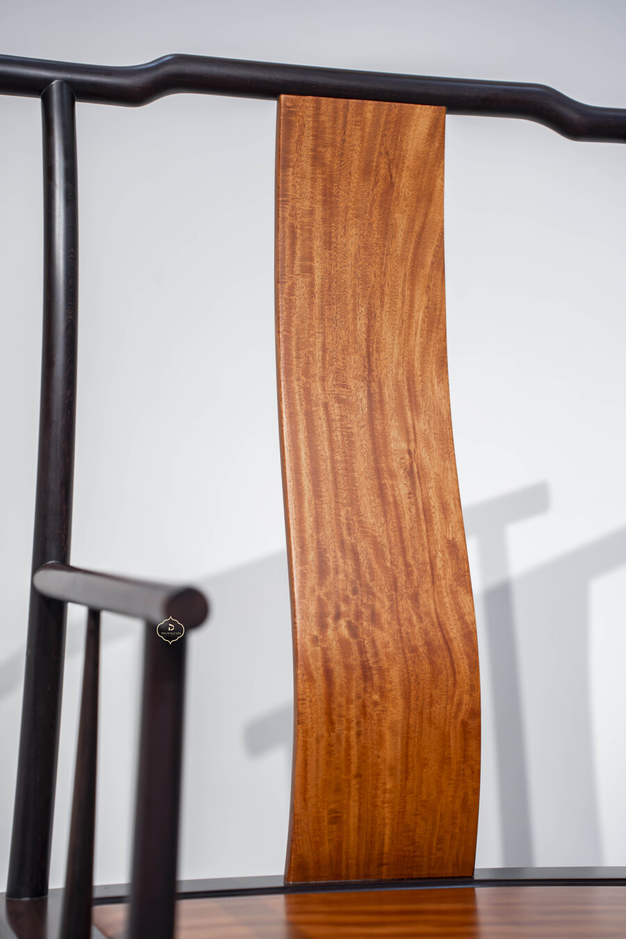 Điểm nhấn nổi bật của sản phẩm nằm ở ván tựa lưng bằng gỗ Hương Nam Mỹ. Ván gỗ được tuyển chọn kỹ, màu nâu vàng ấm, vân gỗ rõ và mềm, tạo sự tương phản tinh tế với khung Muồng sẫm màu. Thiết kế ván cong nhẹ theo dáng lưng giúp tăng độ thoải mái khi ngồi lâu, đồng thời tạo chiều sâu thẩm mỹ cho tổng thể chiếc ghế.