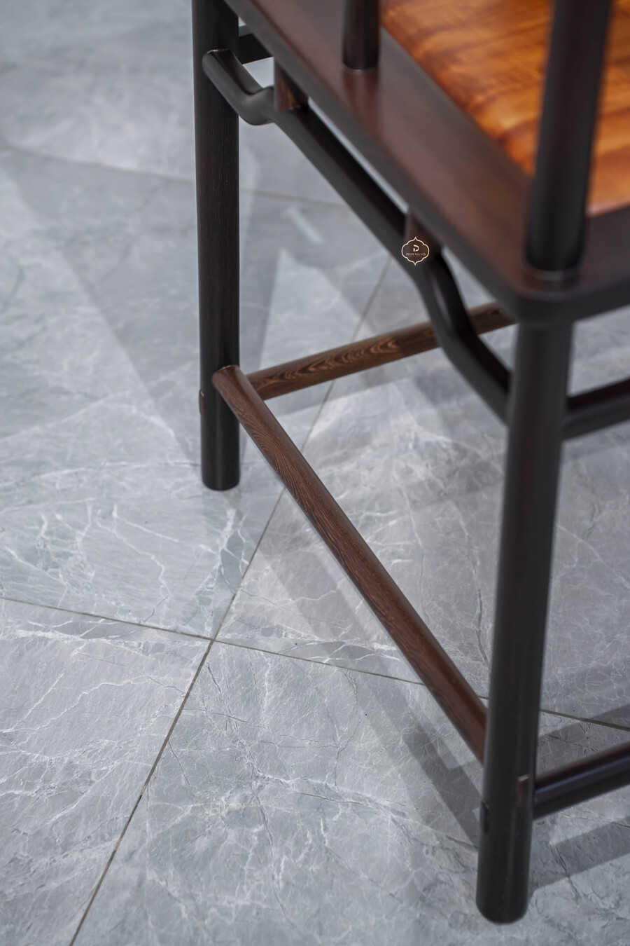 Phần khung ghế làm từ gỗ Muồng – loại gỗ có độ cứng tốt, chịu lực ổn định, vân gỗ thẳng và màu nâu sẫm trầm mặc. Gỗ Muồng giúp tổng thể ghế giữ được dáng chắc, nhẹ mắt, không quá nặng hình khối, phù hợp với nhiều kiểu không gian khác nhau.