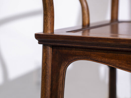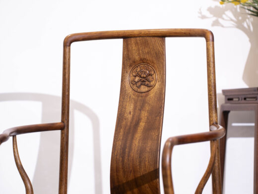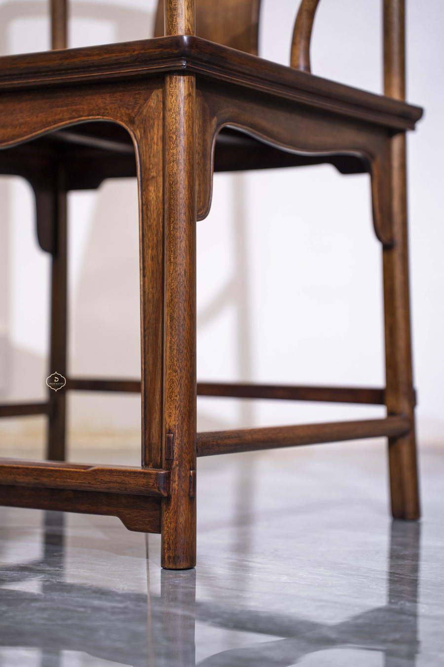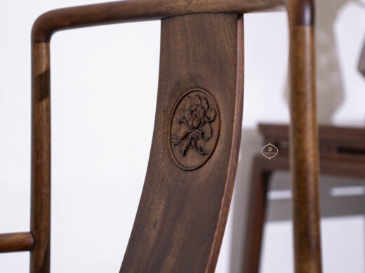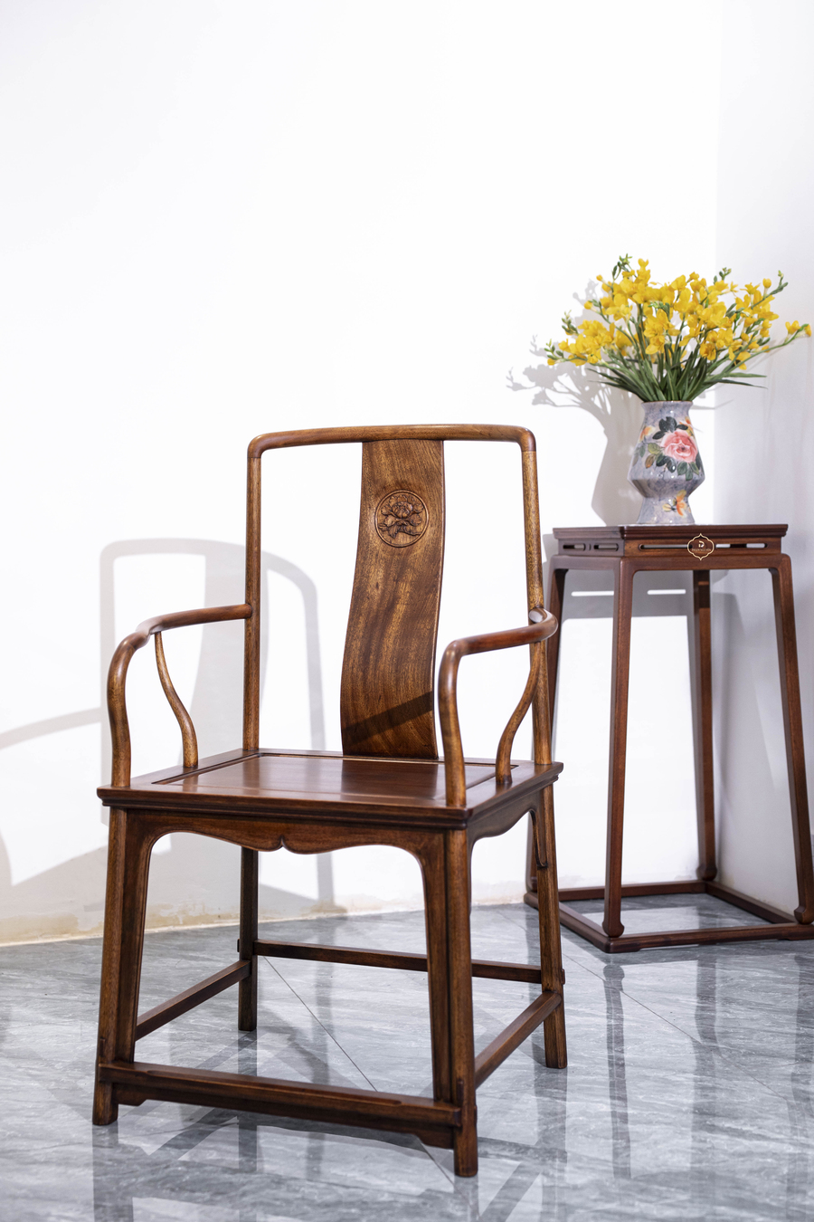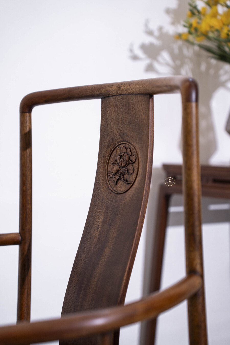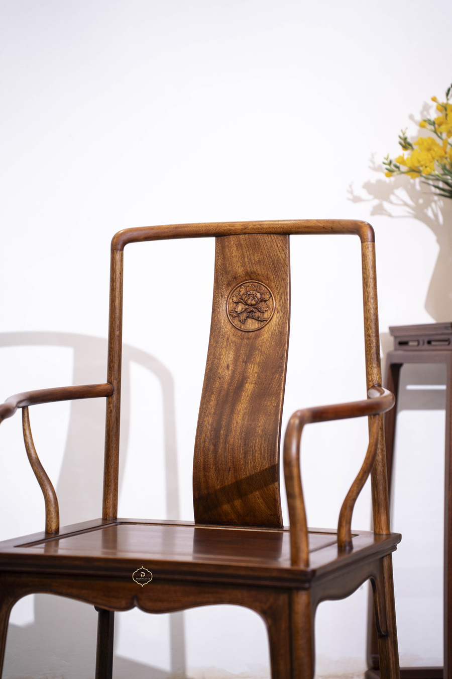 Ghế được chế tác từ gỗ Gụ tự nhiên, loại gỗ nổi tiếng với thớ mịn, vân nhỏ đều và màu nâu trầm ấm. Gỗ Gụ có độ ổn định cao, ít cong vênh, càng sử dụng lâu bề mặt càng lên màu đậm và bóng tự nhiên, tạo cảm giác cổ điển, gần gũi.