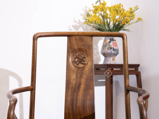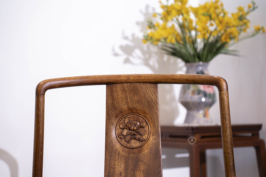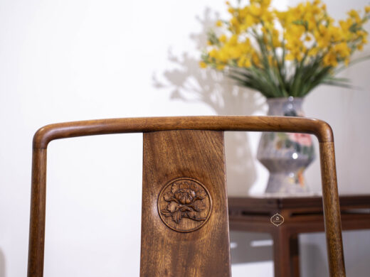 Phần tựa lưng liền tấm, cong nhẹ theo dáng lưng người ngồi, kết hợp họa tiết tròn chạm khắc tinh tế ở trung tâm, vừa tạo điểm nhấn thẩm mỹ vừa giữ được sự trang nhã cần có của một chiếc ghế khách. Tay vịn được bo cong mềm mại, mang lại cảm giác thoải mái khi sử dụng.