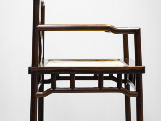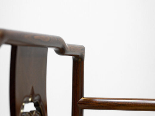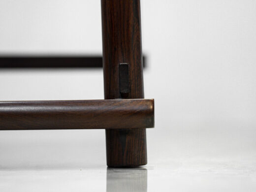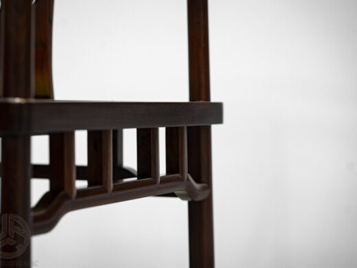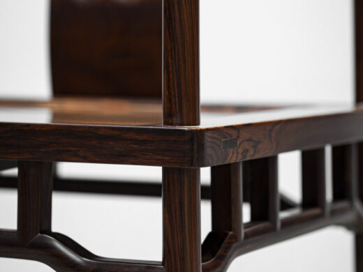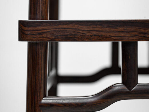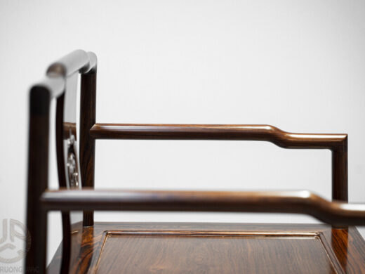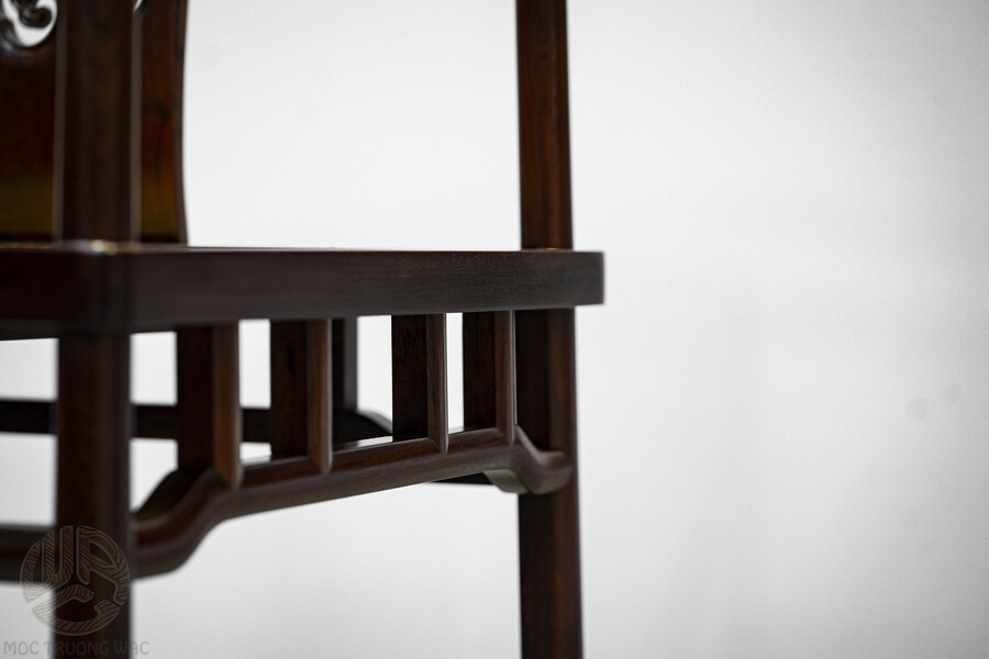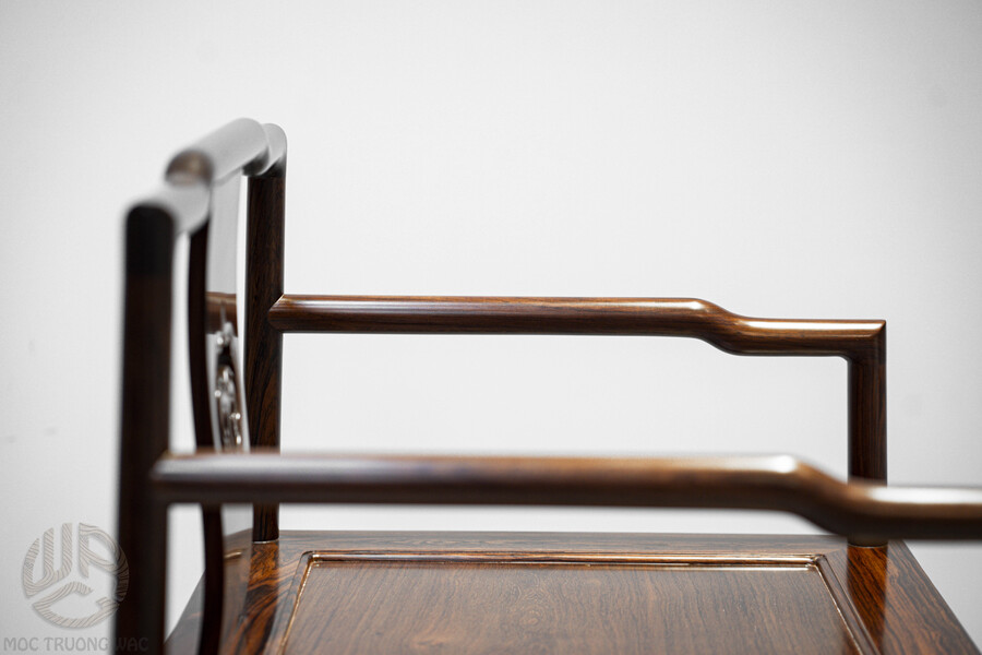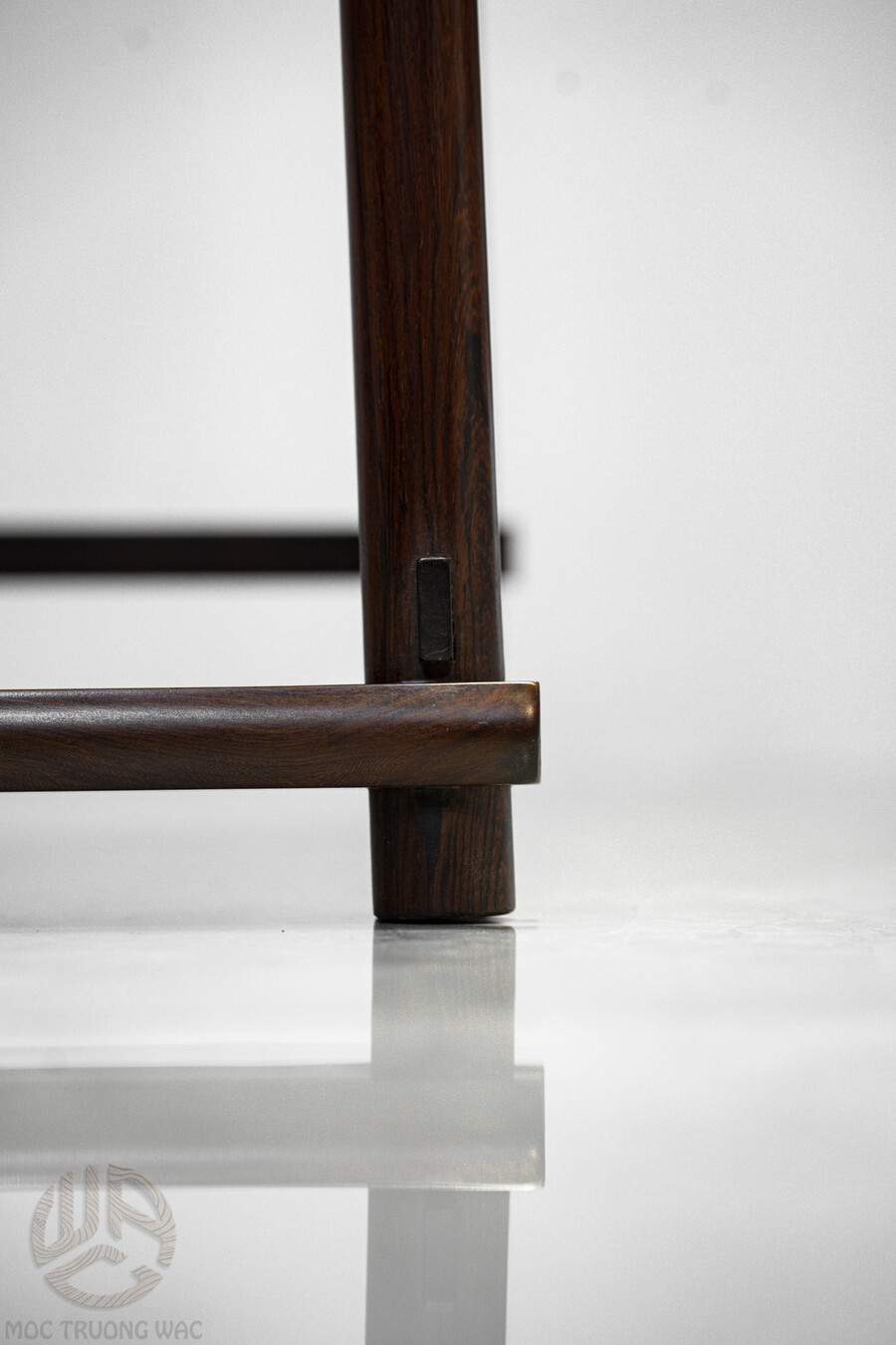 Ghế sử dụng kết cấu mộng gỗ truyền thống, các thanh liên kết dưới chân giúp tăng độ ổn định, hạn chế rung lắc. Bề mặt được xử lý và đánh bóng thủ công, giữ trọn vẹn màu sắc tự nhiên của gỗ Cẩm, mang lại cảm giác ấm áp và gần gũi.