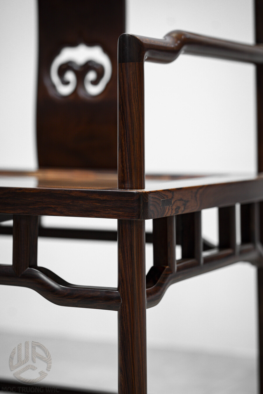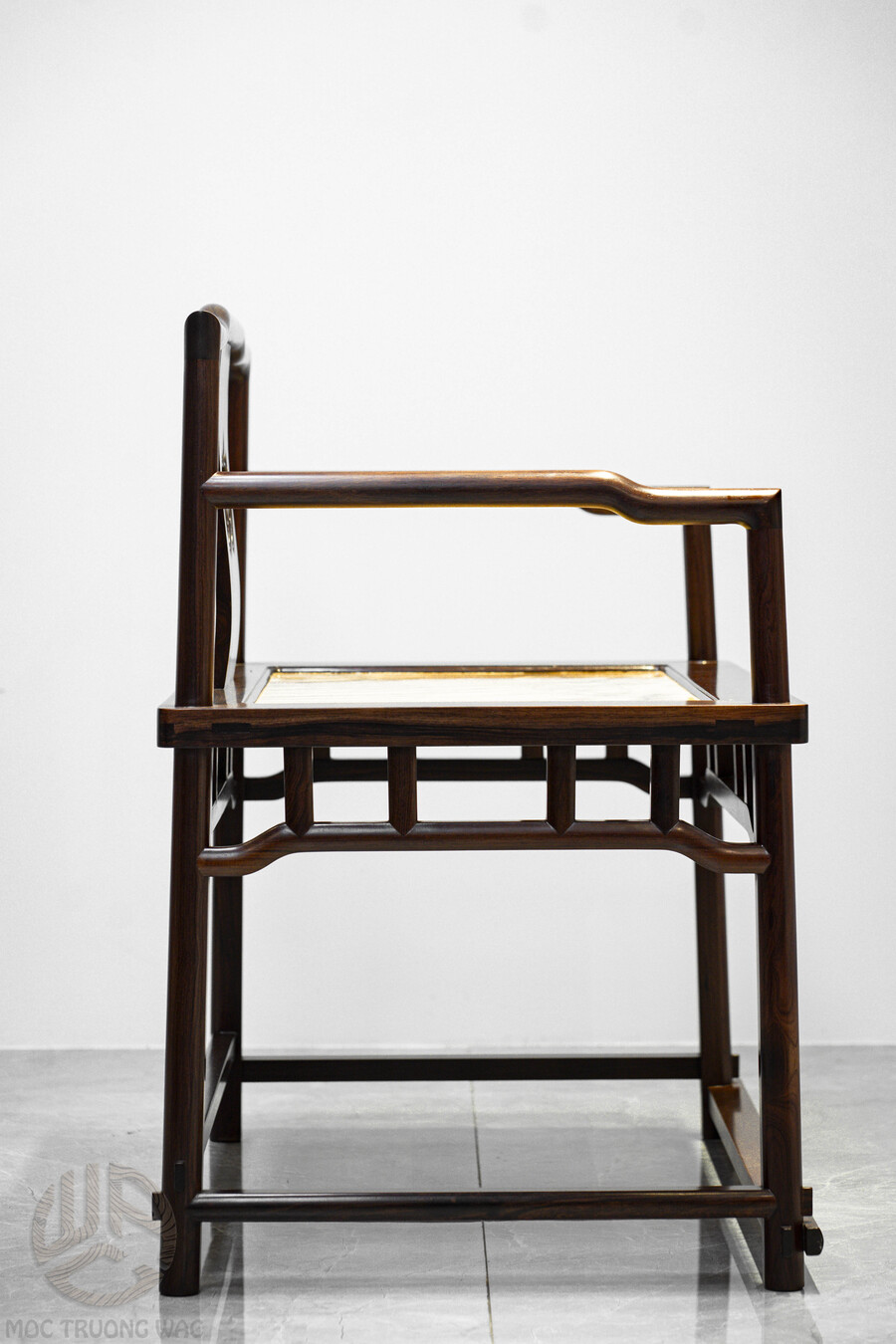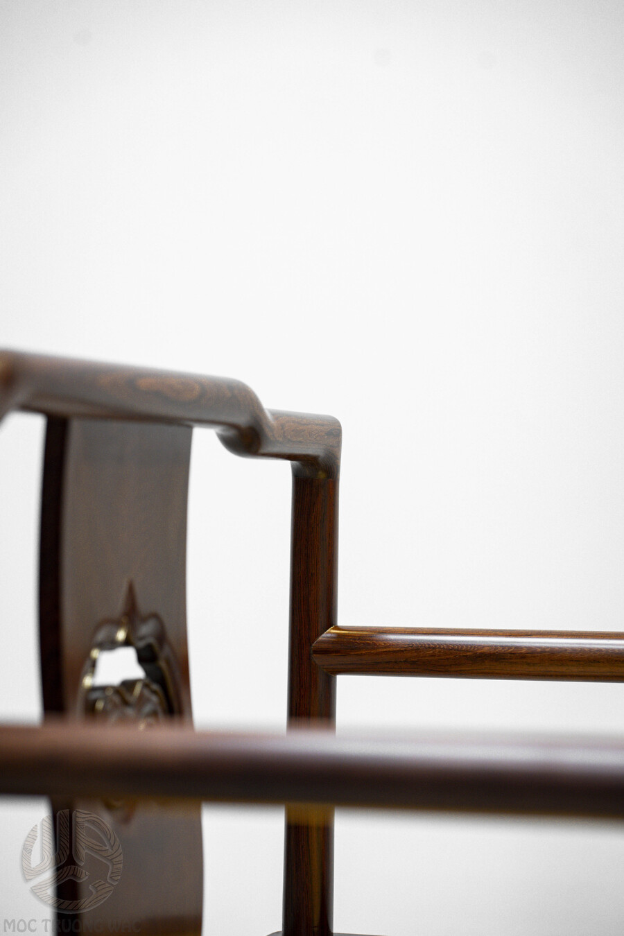 Toàn bộ ghế được chế tác từ gỗ Cẩm tự nhiên, nổi tiếng với đặc tính nặng, cứng, vân gỗ xoáy đẹp và khả năng ổn định cao. Đây là loại gỗ được ưa chuộng trong đồ gỗ cao cấp nhờ độ bền vượt thời gian và càng dùng càng lên màu trầm sang.