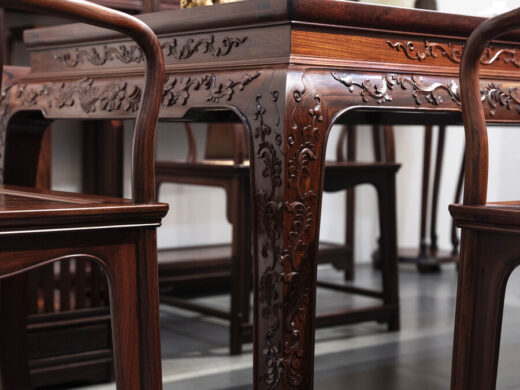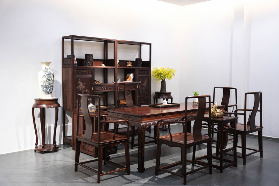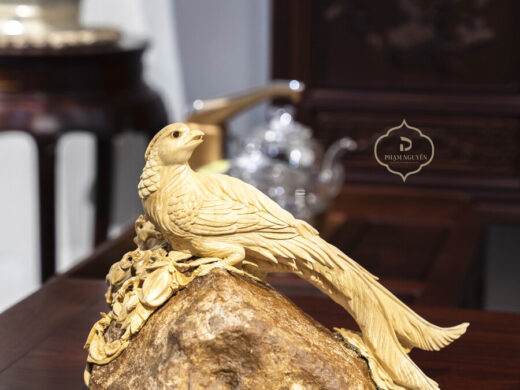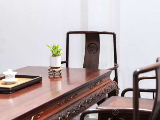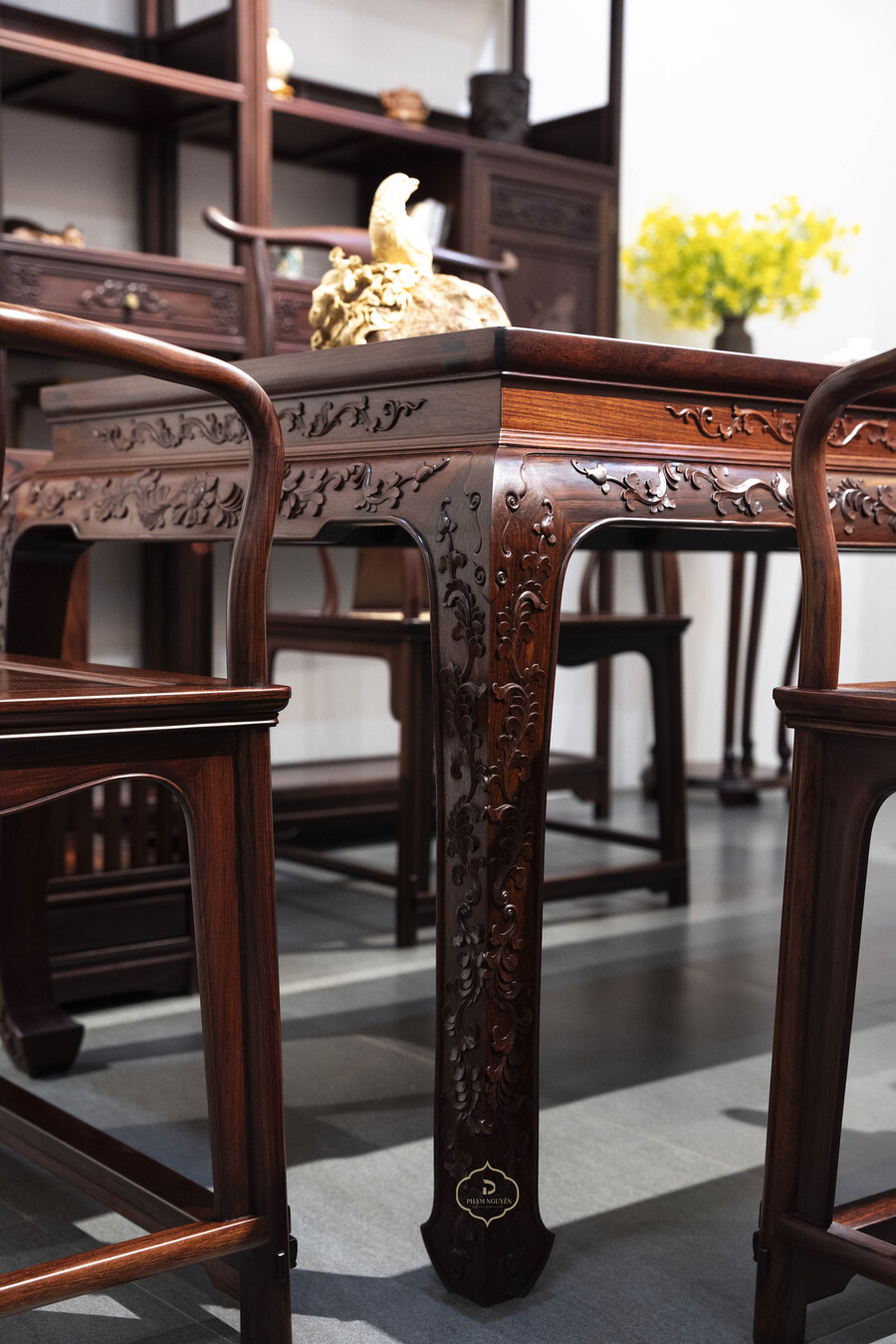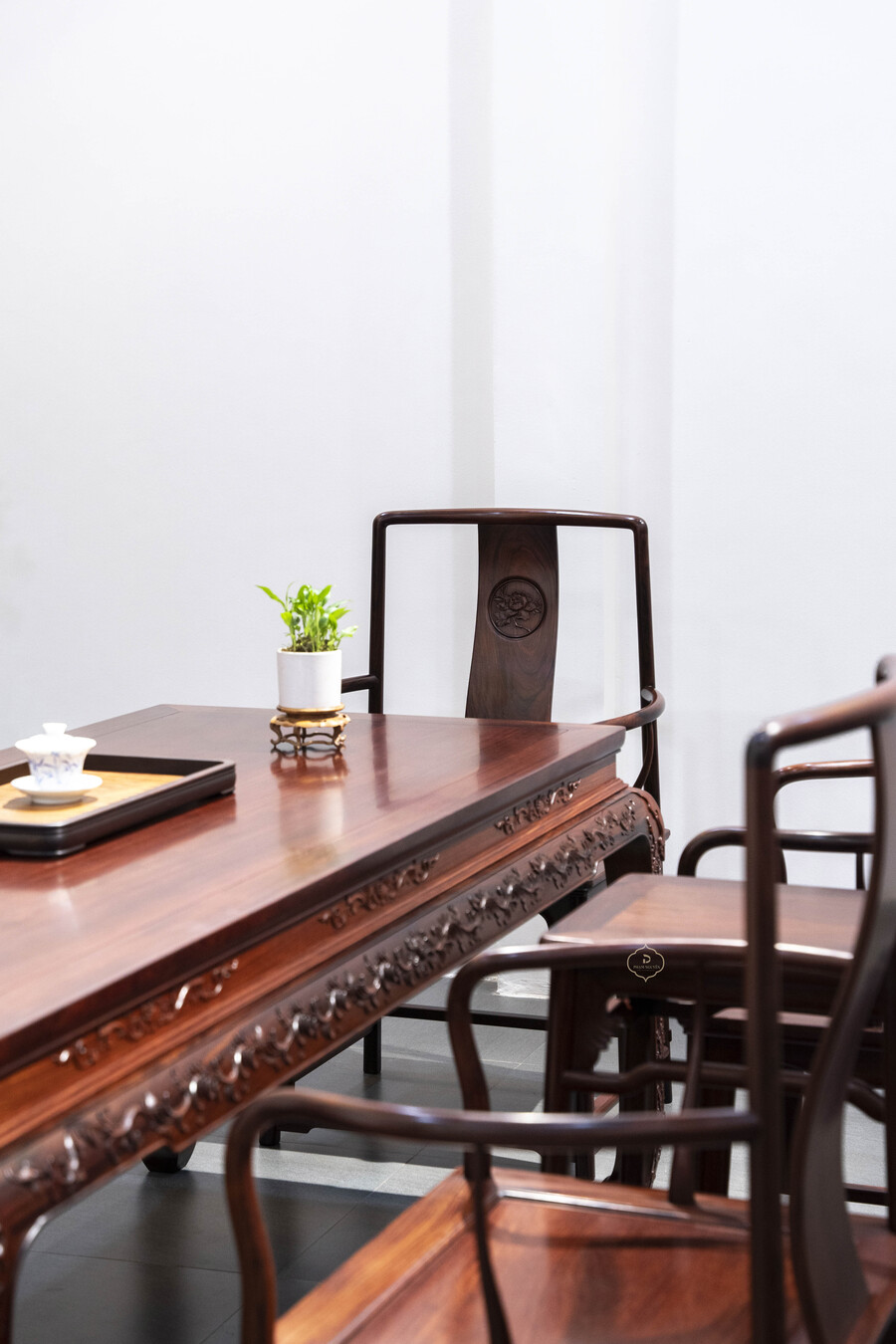 Trung tâm không gian là bàn trà đục hoa thủ công, kích thước lớn, mặt bàn phẳng rộng, viền đục họa tiết mềm mại tạo chiều sâu thị giác. Kết hợp cùng ghế trà chủ lưng cao và ghế khách đồng bộ, bộ bàn ghế mang lại cảm giác vững chãi, bề thế nhưng vẫn thanh thoát, rất phù hợp cho những buổi thưởng trà dài, tiếp khách thân tình hoặc không gian tiếp đón trang trọng.