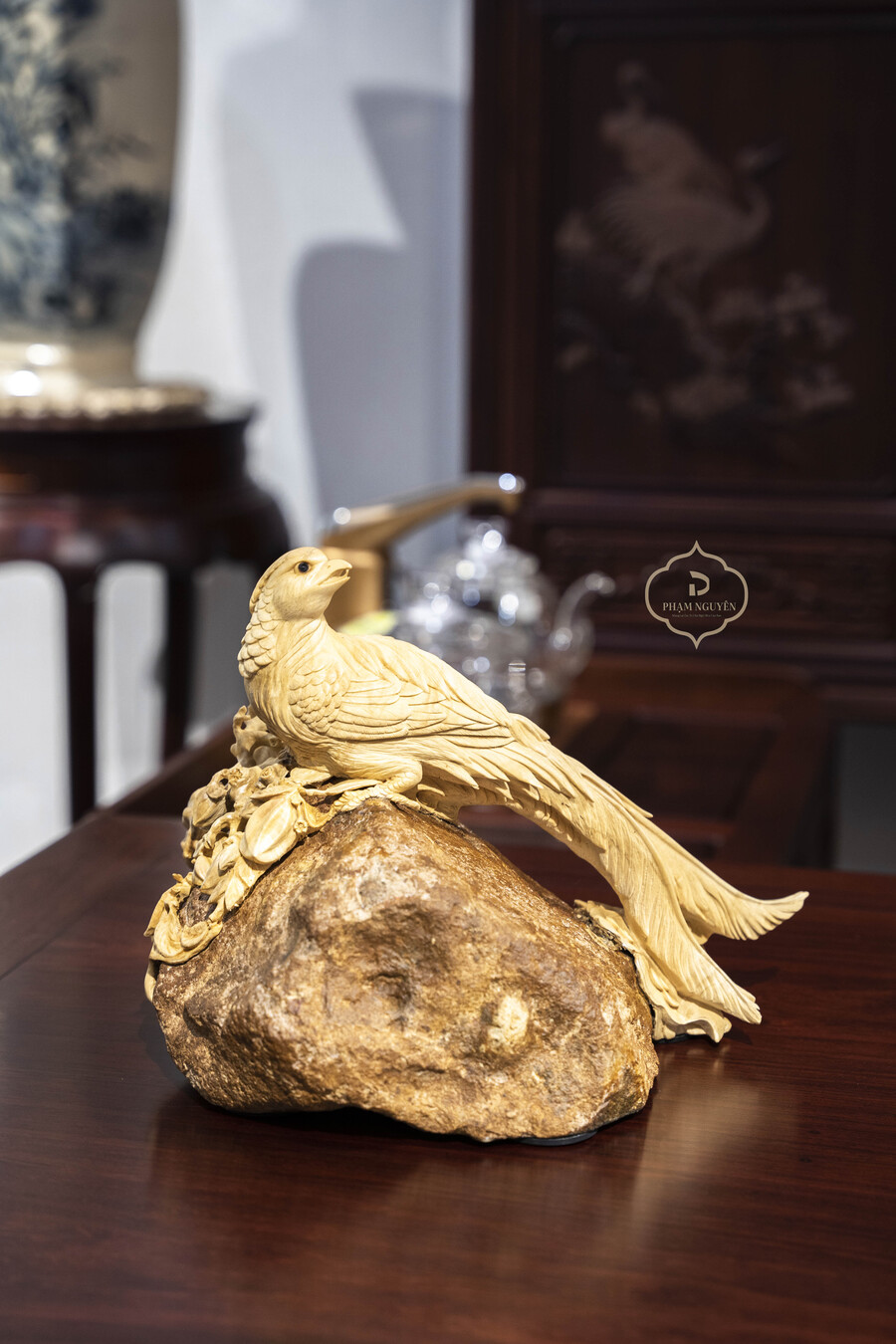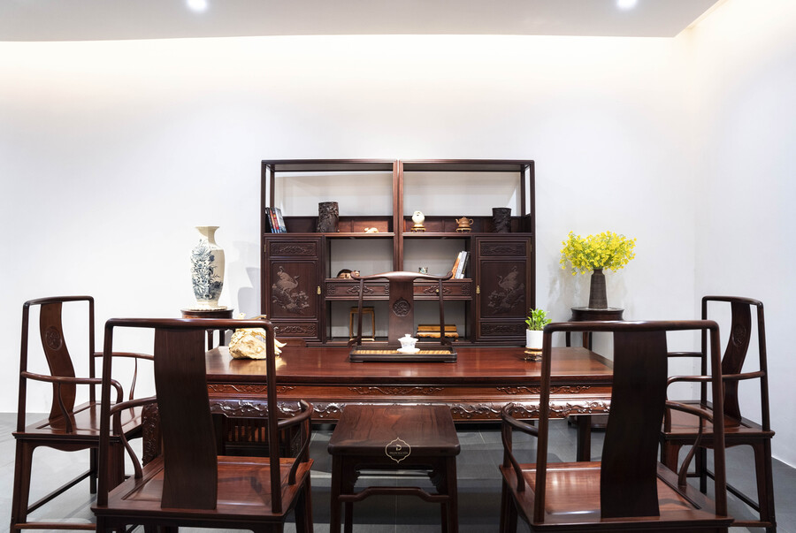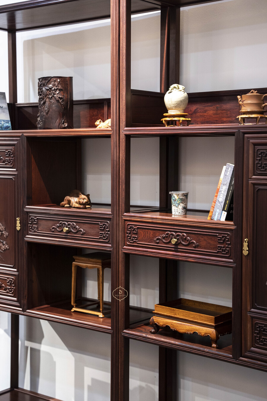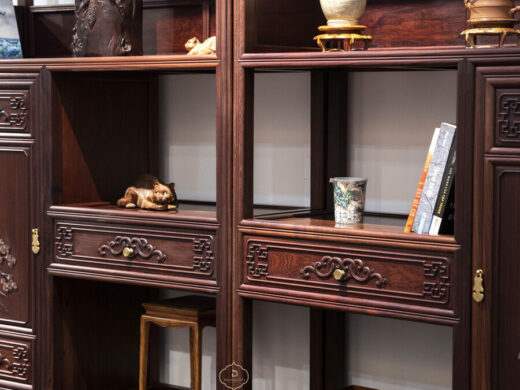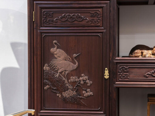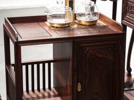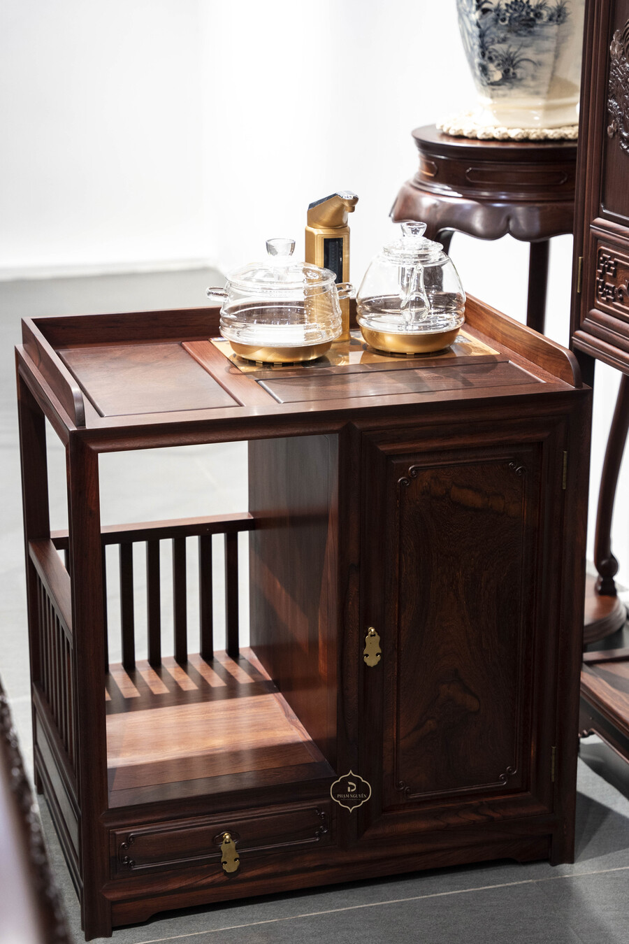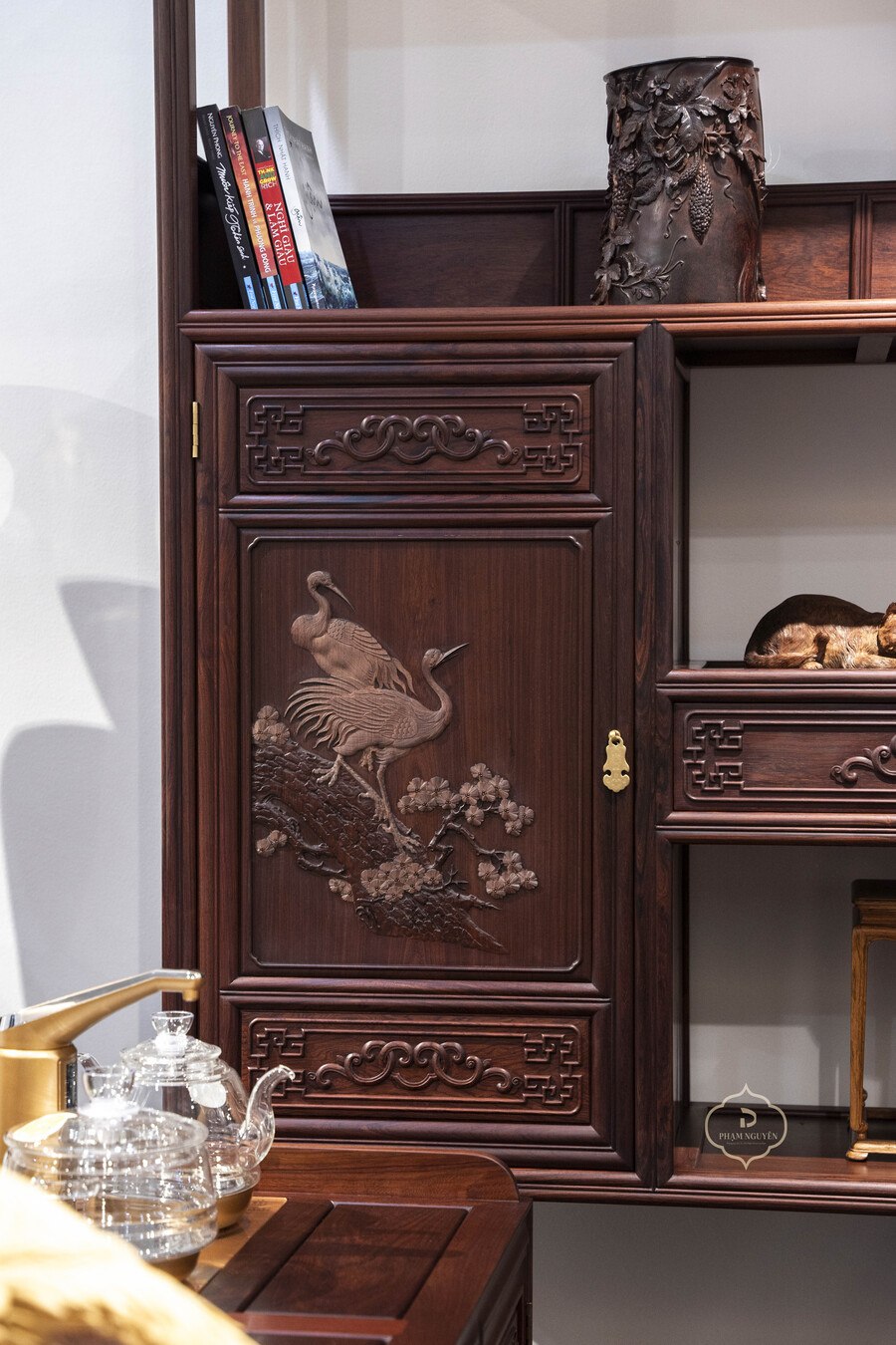 Hệ tủ đi kèm là điểm nhấn quan trọng của bộ phòng trà. Cặp tủ Tùng Hạc Diên Niên chạm khắc thủ công không chỉ đóng vai trò lưu trữ trà cụ, sách, đồ trưng bày mà còn mang ý nghĩa phong thủy – trường thọ – phú quý. Tủ bếp đun nước được bố trí gọn gàng, tối ưu thao tác pha trà, giúp không gian luôn ngăn nắp và liền mạch.