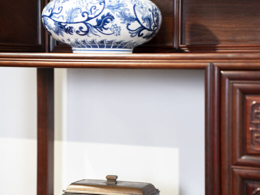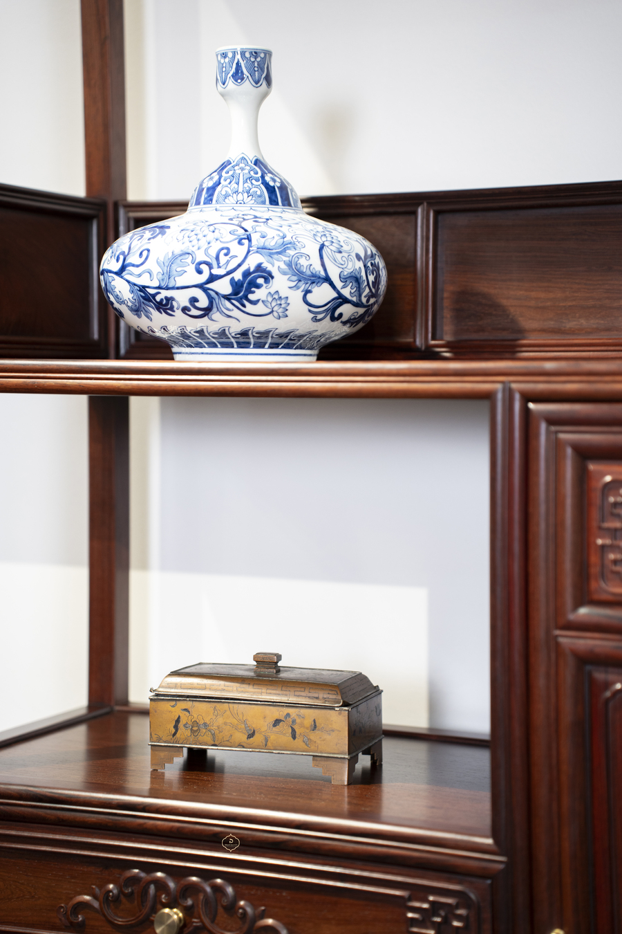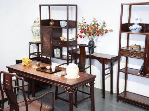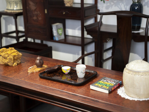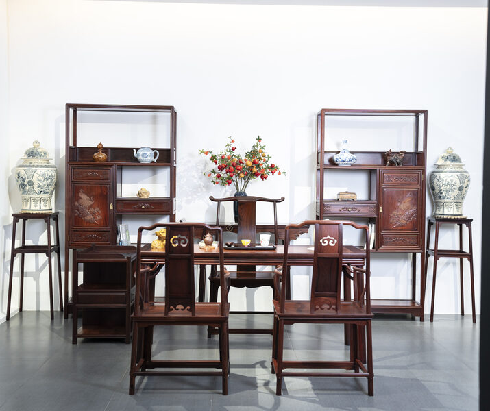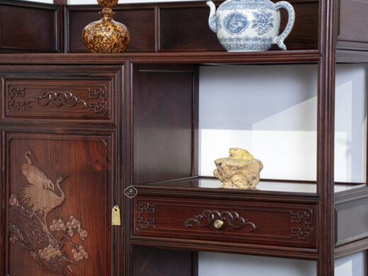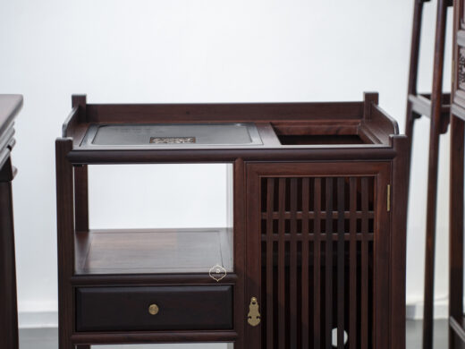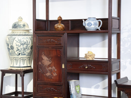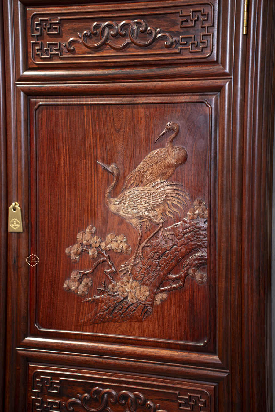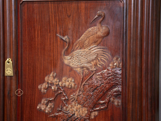 Hai bên phòng trà là cặp tủ kê đồ Tùng Hạc Diên Niên – điểm nhấn nghệ thuật nổi bật của toàn bộ không gian. Họa tiết tùng – hạc được chạm khắc thủ công tinh xảo, mang ý nghĩa trường thọ, phúc khí và sự bền vững. Các khoang mở – khoang kín được bố trí linh hoạt, phù hợp trưng bày đồ trà, sách, gốm hoặc vật phẩm phong thủy.