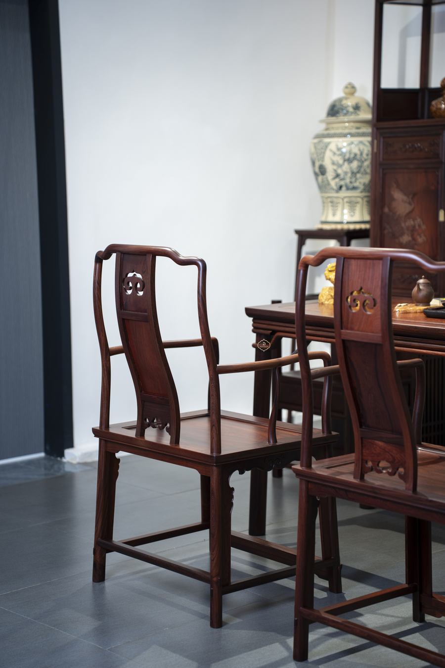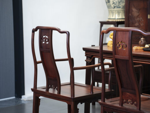 Trung tâm không gian là bàn trà mặt hương bông với kích thước vừa vặn, vân gỗ tự nhiên nổi rõ, bề mặt xử lý kỹ giúp tôn lên sắc nâu trầm đặc trưng của gỗ cẩm. Kết hợp cùng ghế trà chủ và ghế khách dáng cao, lưng cong mềm mại, bộ ghế không chỉ đảm bảo sự thoải mái khi ngồi lâu mà còn giữ được thế ngồi trang nghiêm, đúng tinh thần trà đạo truyền thống.