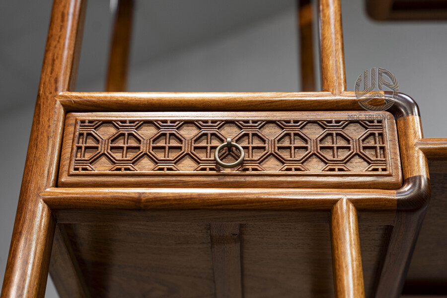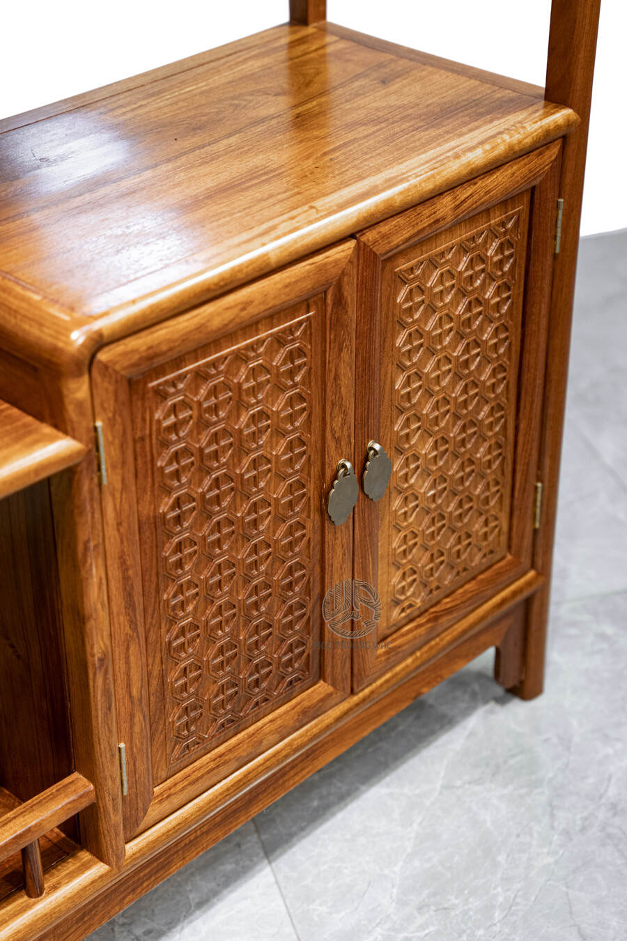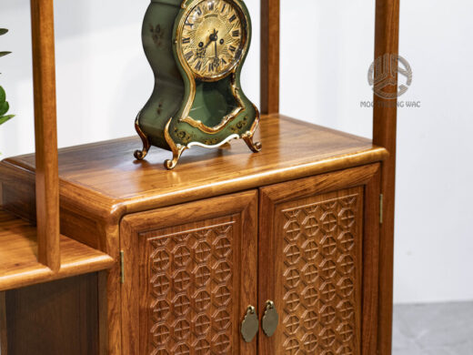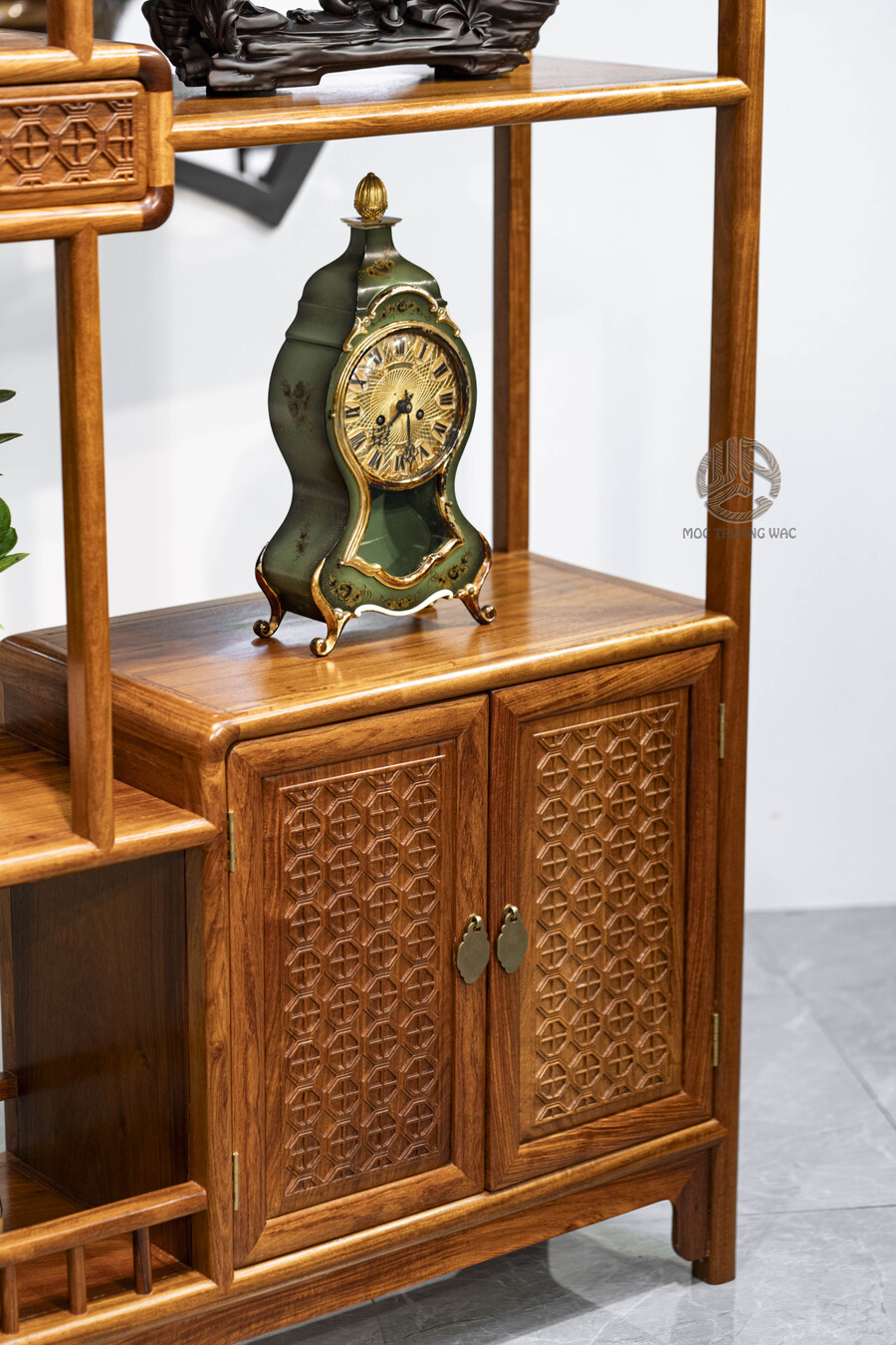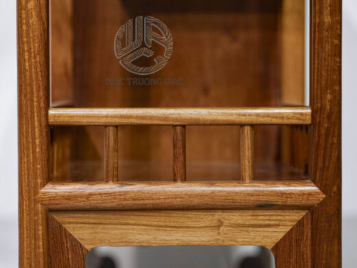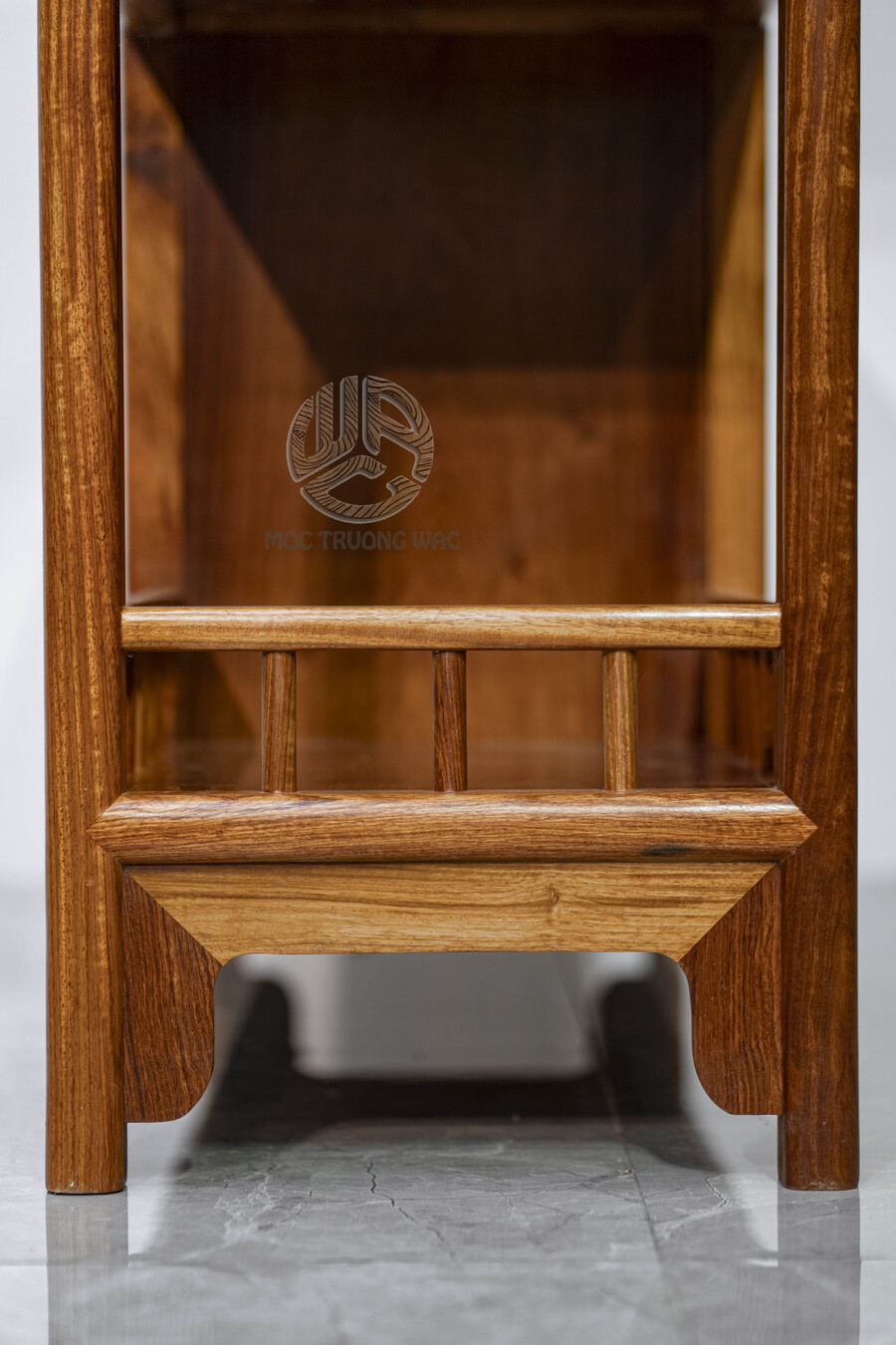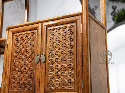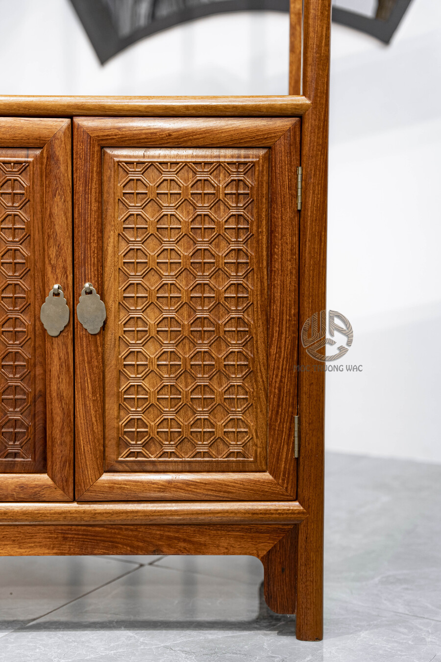 Tủ trà đan xen gỗ Hương Lào là mẫu tủ trưng bày mang tinh thần truyền thống cách tân, nổi bật với bố cục đan xen linh hoạt, vừa đảm bảo công năng sử dụng, vừa tạo dấu ấn thẩm mỹ rõ rệt cho không gian.