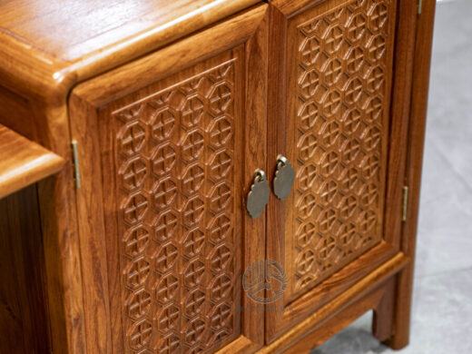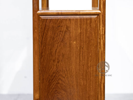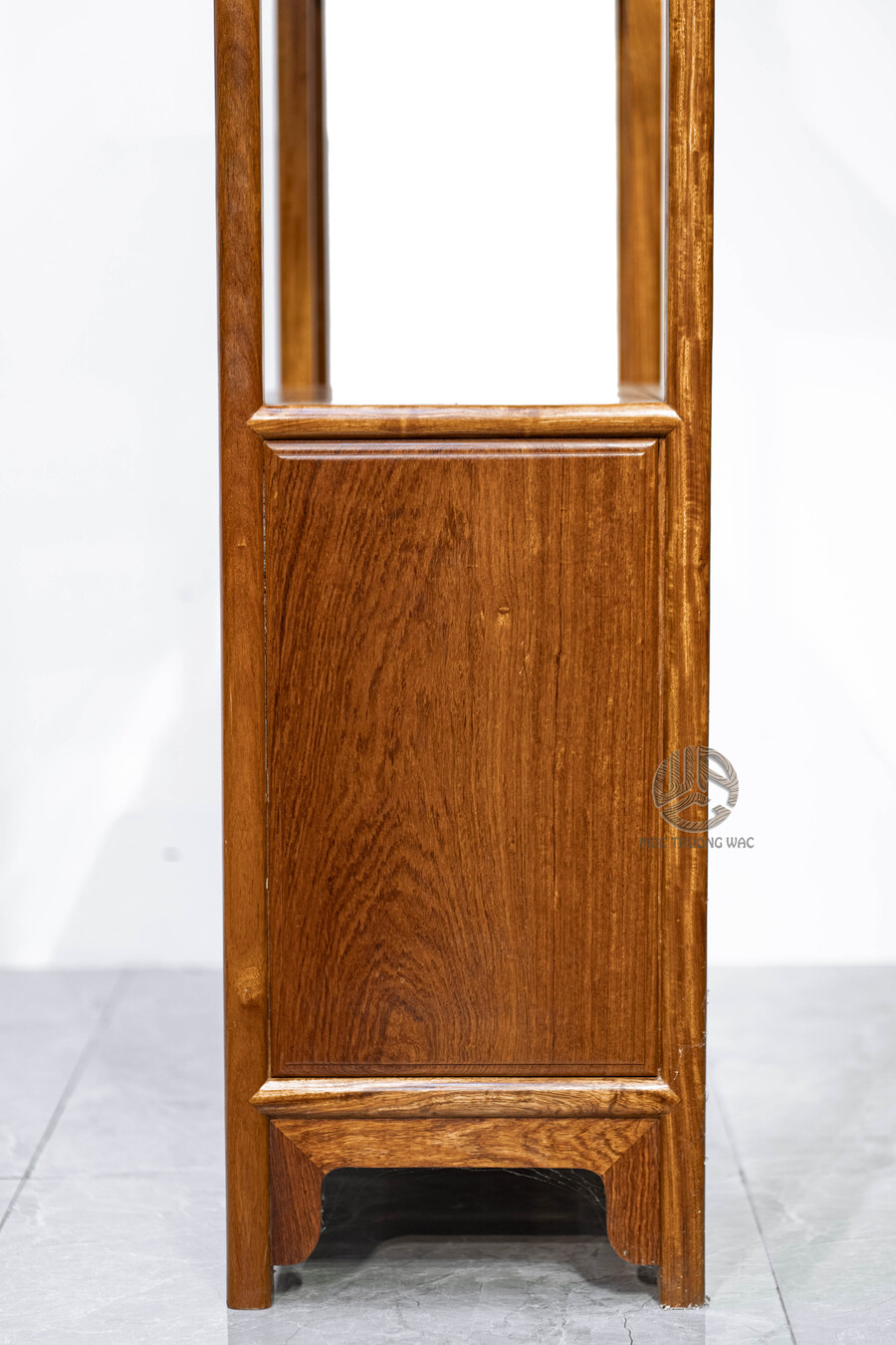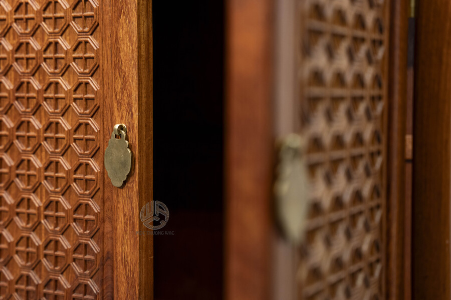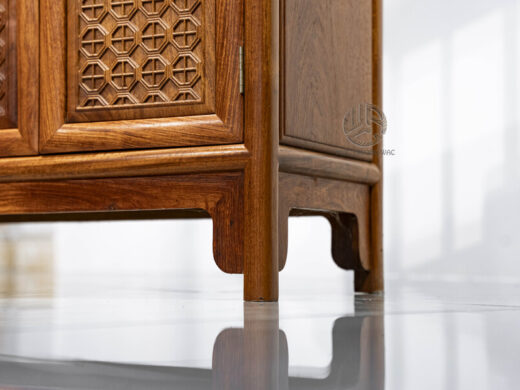 Cánh tủ được xử lý chạm họa tiết hình học nhẹ, không cầu kỳ nhưng đủ tạo điểm nhấn, kết hợp tay nắm nhỏ tinh tế, giữ trọn tinh thần mộc và thanh lịch của gỗ Hương. Dáng tủ cao, khung chắc chắn, tỷ lệ hài hòa, giúp tủ vừa nổi bật vừa không gây nặng nề cho không gian.