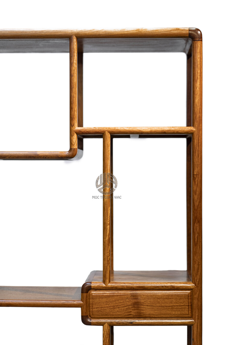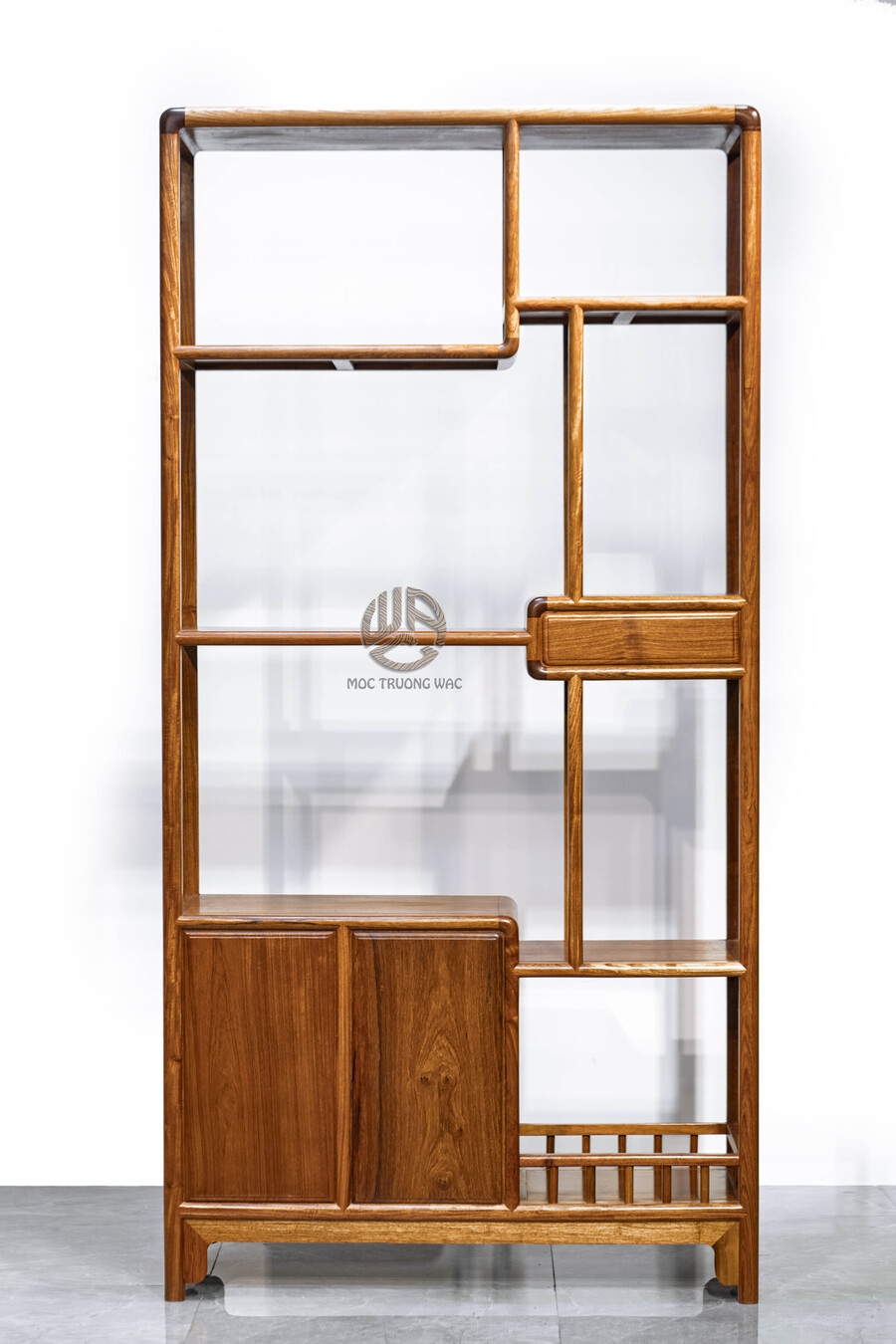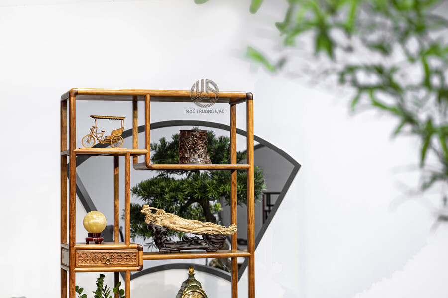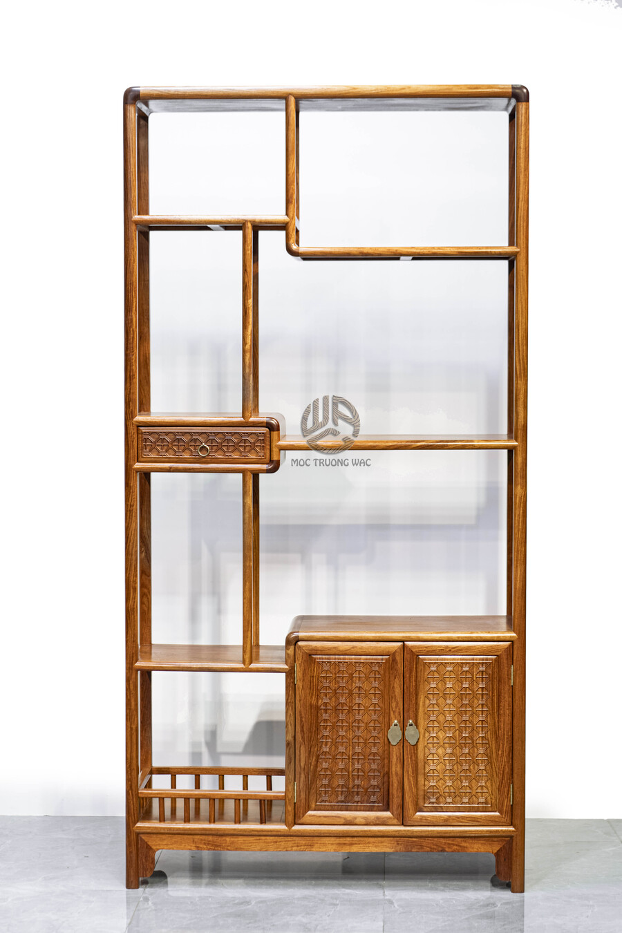 Thiết kế tủ theo dạng đan xen bất đối xứng giữa các tầng kệ mở và khoang kín, tạo nhịp điệu thị giác sinh động nhưng vẫn giữ được sự cân bằng tổng thể. Các tầng kệ mở phù hợp trưng bày ấm trà, tượng nhỏ, cây cảnh, đồ decor; trong khi khoang tủ kín phía dưới giúp lưu trữ gọn gàng, giữ không gian luôn ngăn nắp.