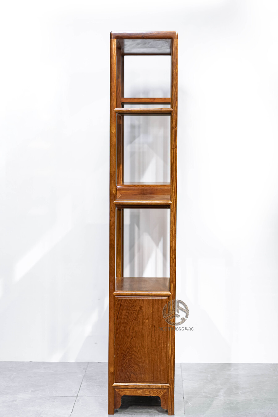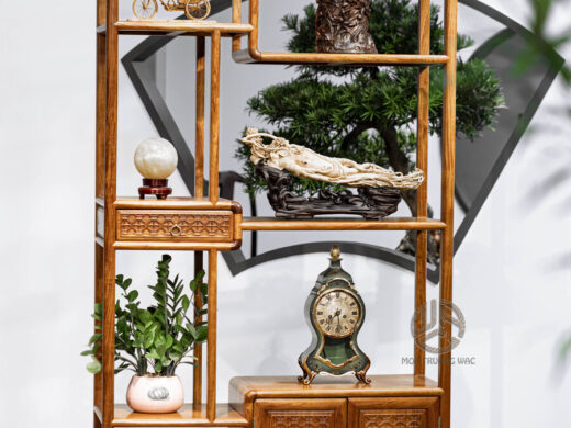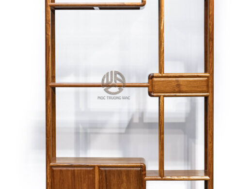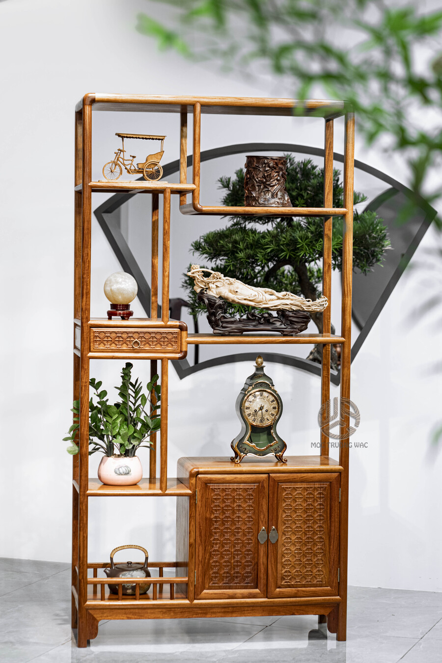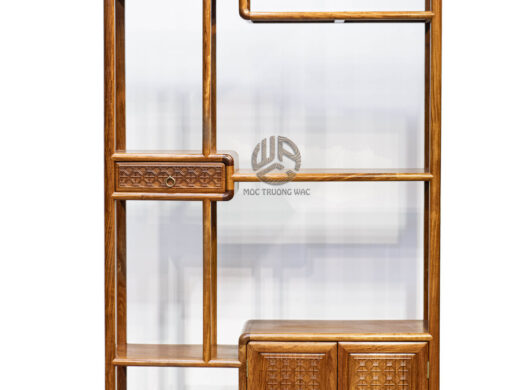 Thiết kế tủ theo dạng đan xen bất đối xứng giữa các tầng kệ mở và khoang kín, tạo nhịp điệu thị giác sinh động nhưng vẫn giữ được sự cân bằng tổng thể. Các tầng kệ mở phù hợp trưng bày ấm trà, tượng nhỏ, cây cảnh, đồ decor; trong khi khoang tủ kín phía dưới giúp lưu trữ gọn gàng, giữ không gian luôn ngăn nắp.
