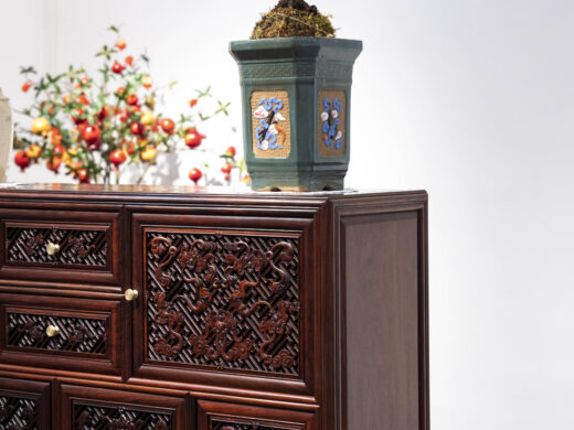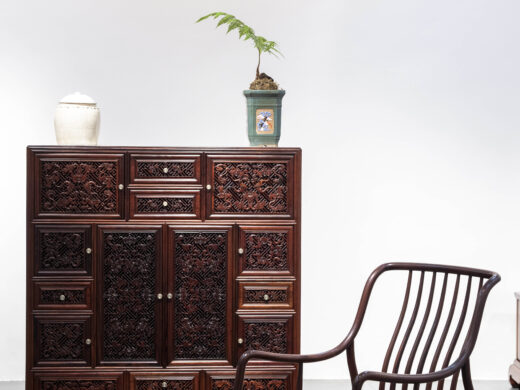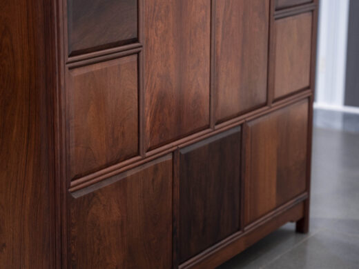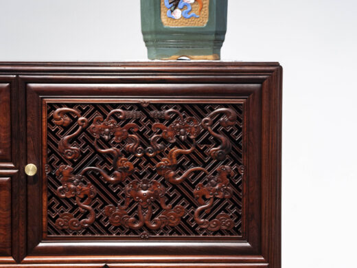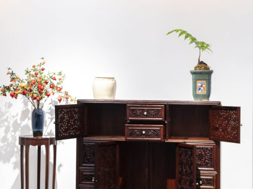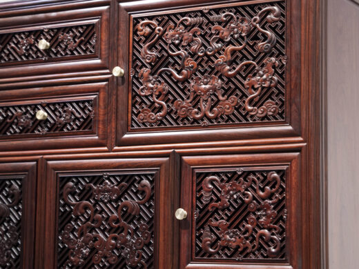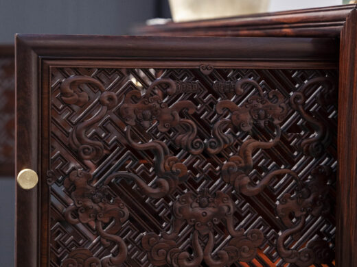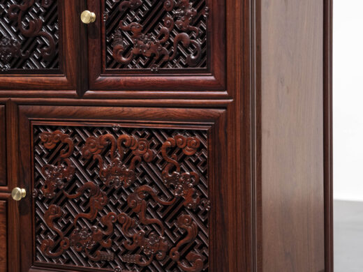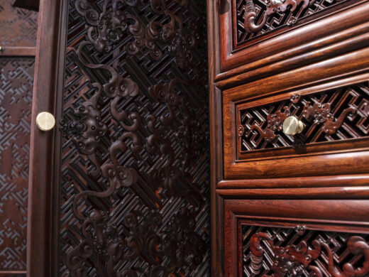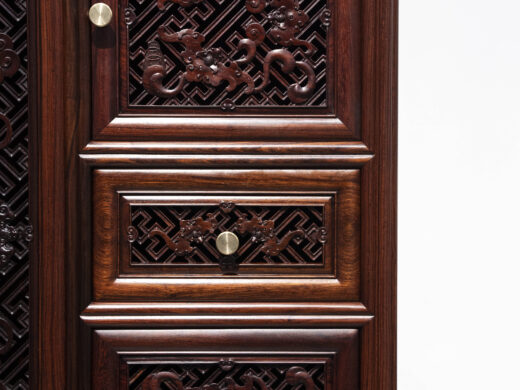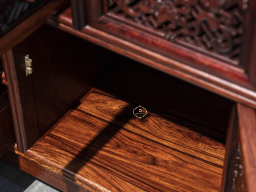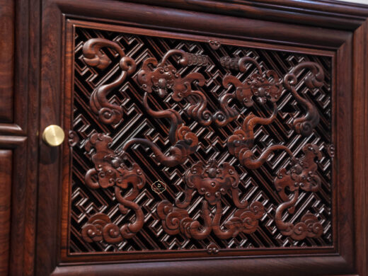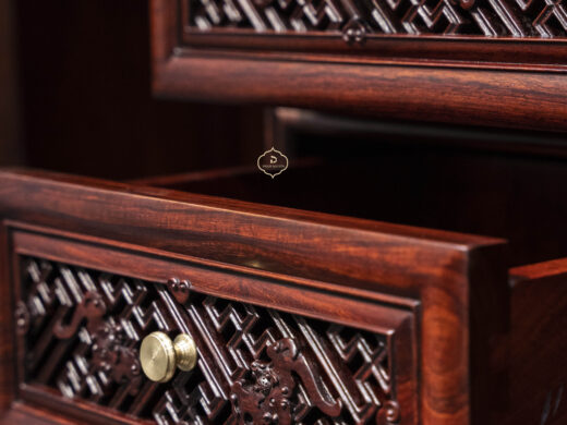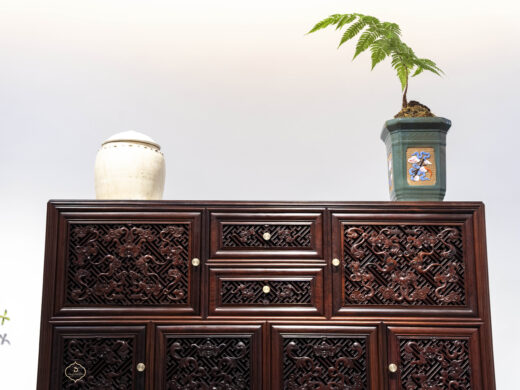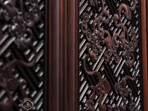 Điểm nhấn nổi bật của tủ nằm ở hệ hoa văn chạm khắc phủ kín các cánh và ngăn, được thực hiện thủ công với mật độ dày, đường nét sắc nhưng không thô. Các mảng chạm tạo hiệu ứng nổi – chìm rõ rệt, giúp bề mặt tủ có chiều sâu và sức hút thị giác mạnh, đúng tinh thần “vạn phúc” – nhiều phúc khí hội tụ.